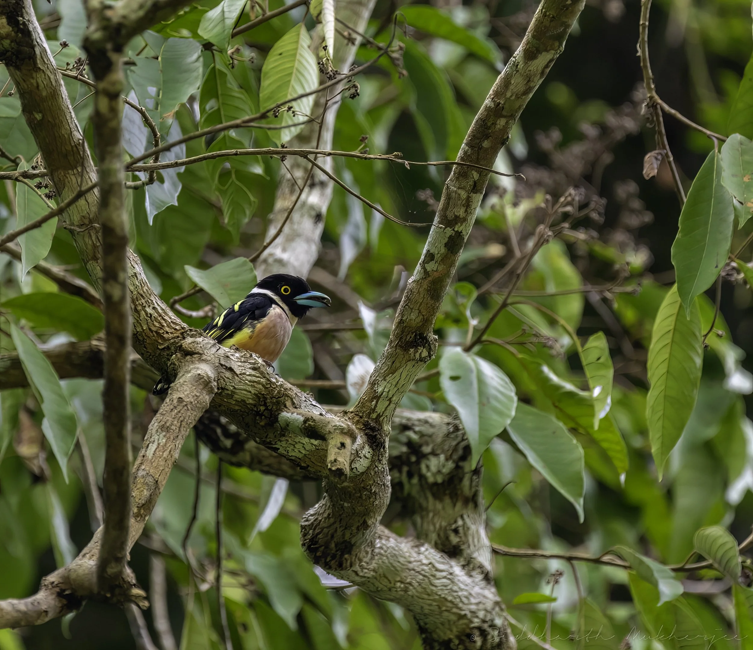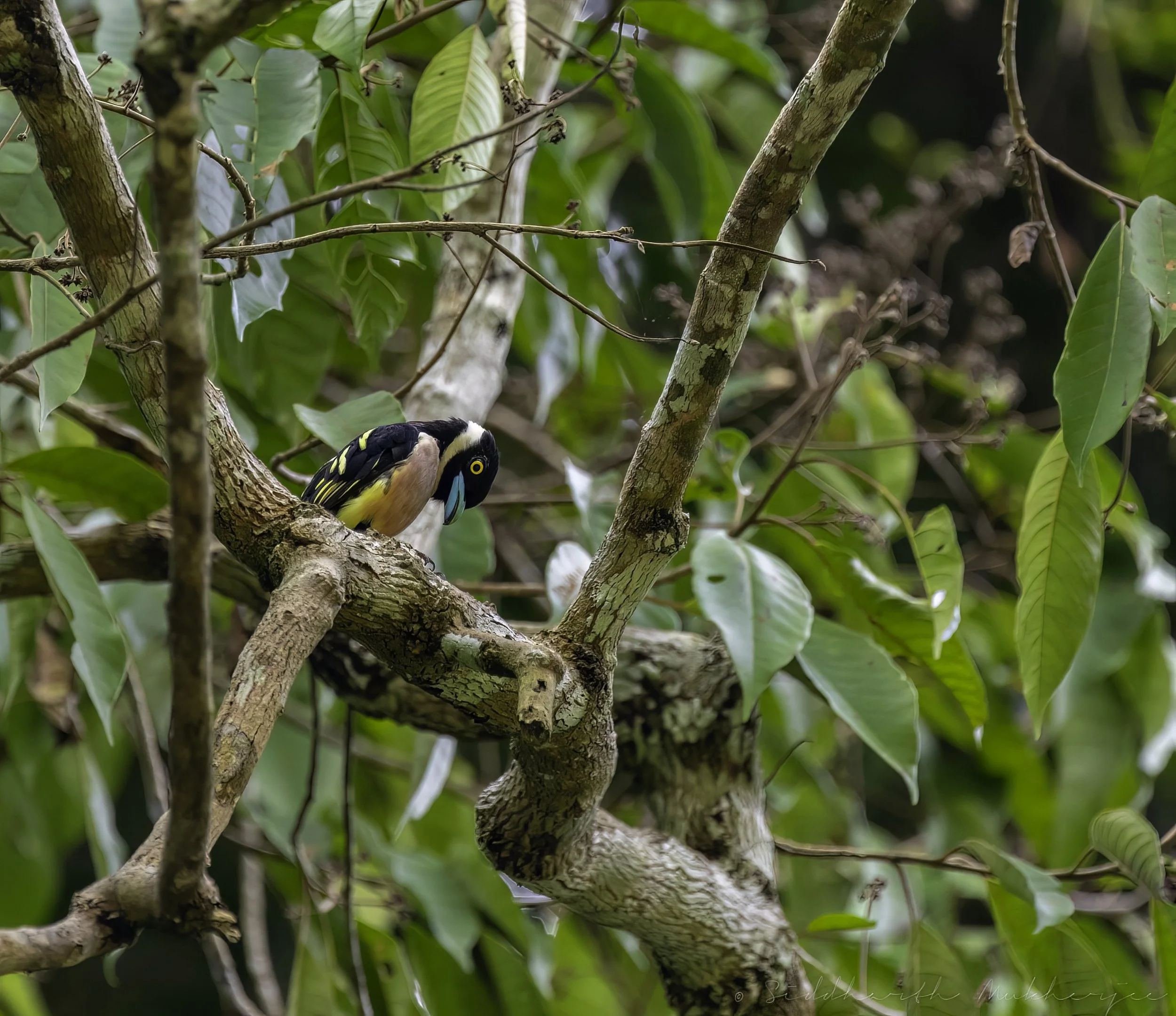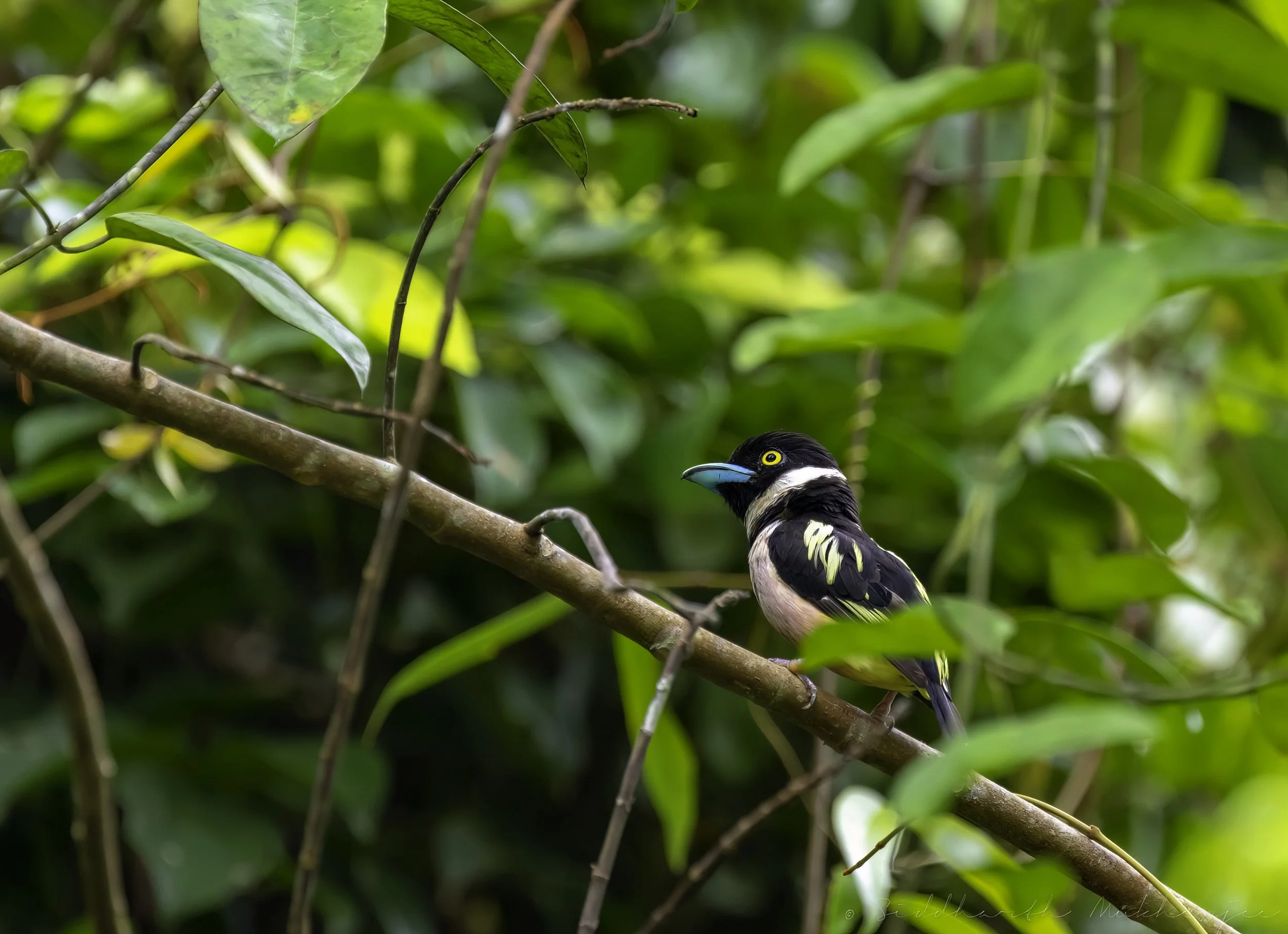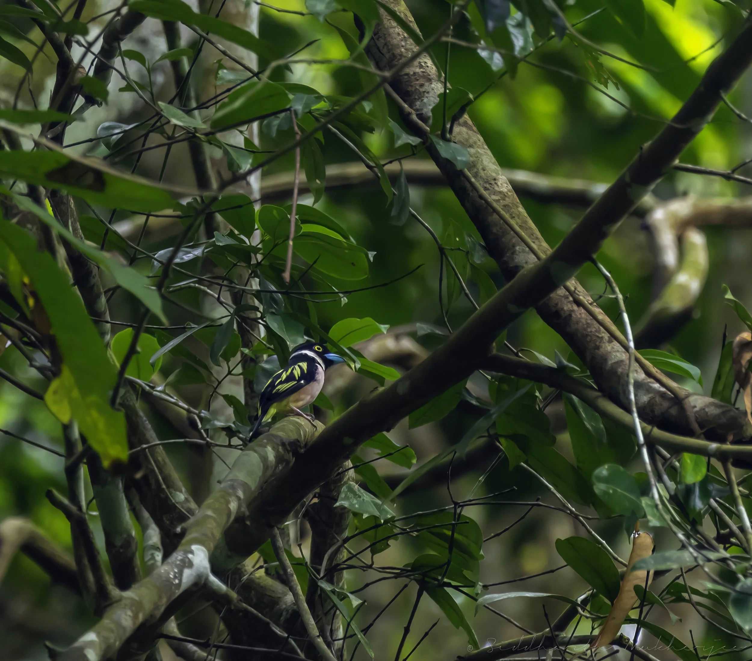 The strikingly patterned broadbills of Asia are forest canopy birds, often revealed only by their throaty staccato calls. The bold contrasting swatches of black, yellow, and red or green in their plumage often extend into a very large and brightly coloured blue or silver bill, creating a visual impact to equal that of any other passerine in these forests. Their distinctive baglike nests are suspended by a long vine or tendril far beneath overhanging branches, and often over water or near a bee or wasp nest to protect the nest from tree-bound predators. As with the green broadbills, these Asian birds have a cousin in Africa with very different appearance, but we know very little about it.
