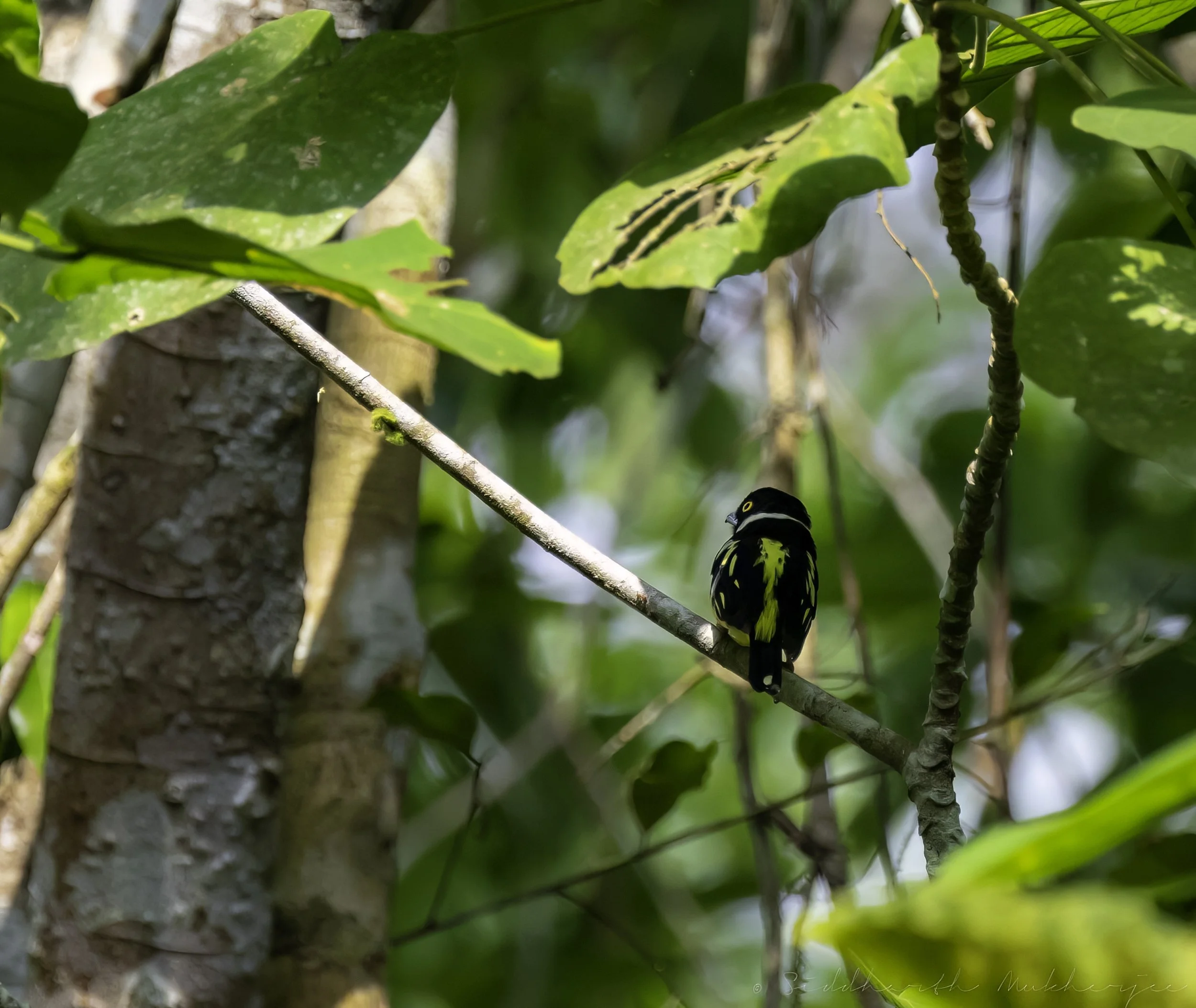 The Black-and-Yellow broadbill is a small, distinctive species of typical broadbill that is 13.5–15 cm long and weighing between 31–39 g. Males have black heads and upperparts with a white collar and black breastband, along with prominent yellow markings on the back and wings. The underparts are vinous-pink, fading to yellow towards the belly and undertail coverts (tail feathers that cover the underside of the base of the tail). The tail is black, with yellow spots on the middle feathers and whiter ones on the outer feathers. The iris is pale yellow, while the bill is bright blue, with a green tip to the upper mandible and black edges. The base of the bill lacks bristles, which are present in some other species of broadbills. The legs are reddish, with long tarsometatarsi. The species shows some sexual dimorphism, with females having a gap in the centre of the black breastband. Juveniles lack a well-defined breastband and have a pale yellow supercilium (a stripe running from the beak to above the eye) with grayish-white underparts.