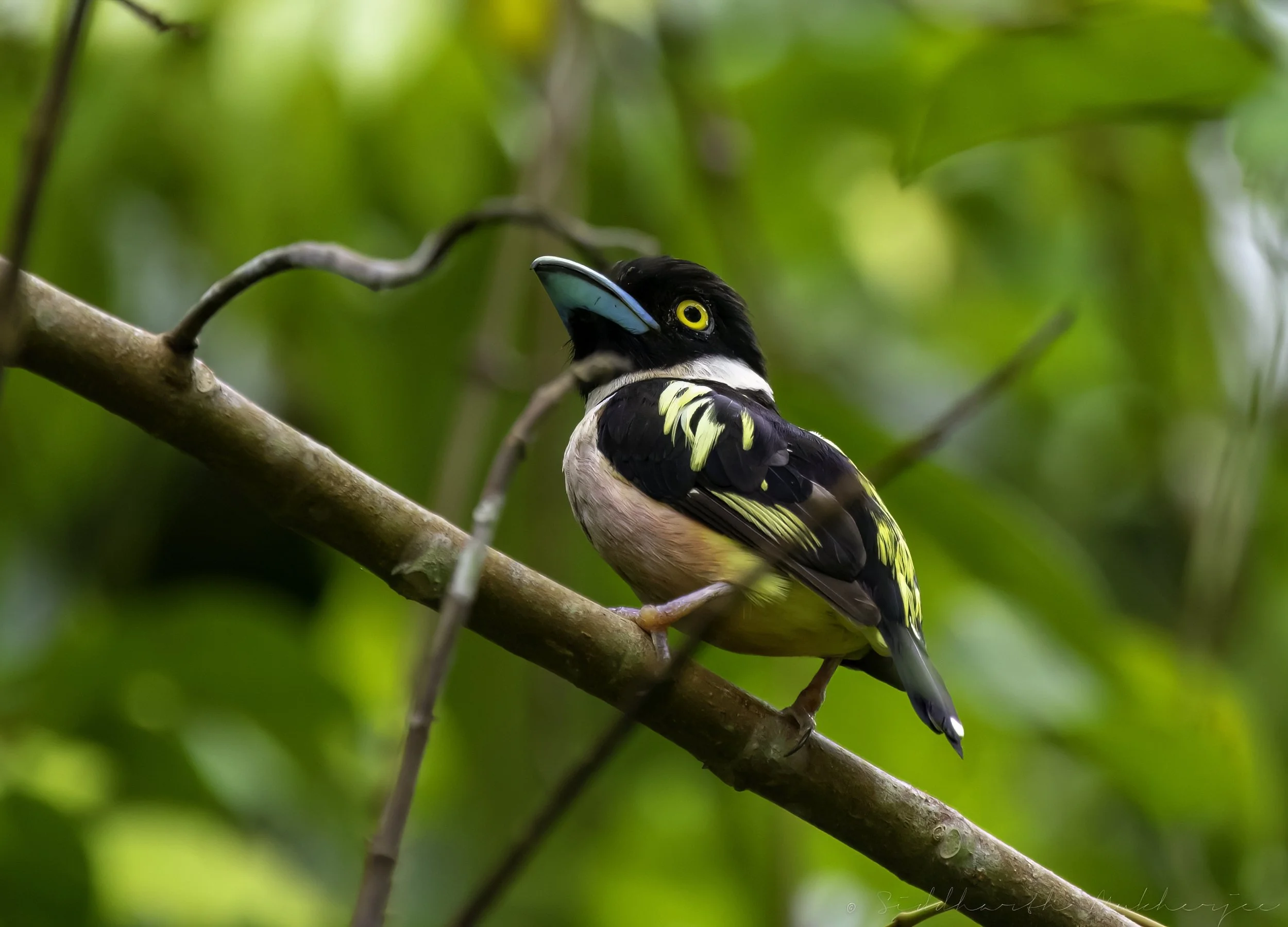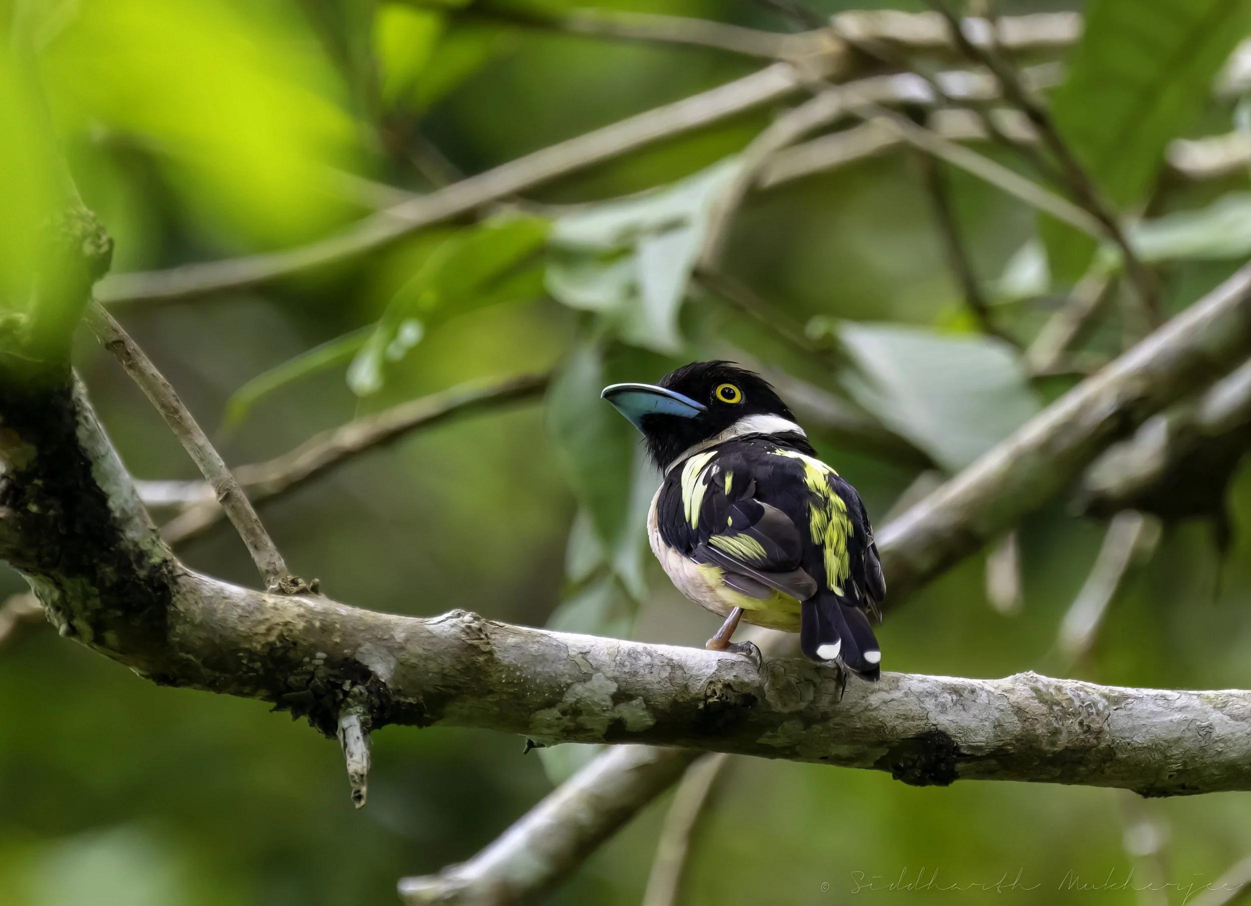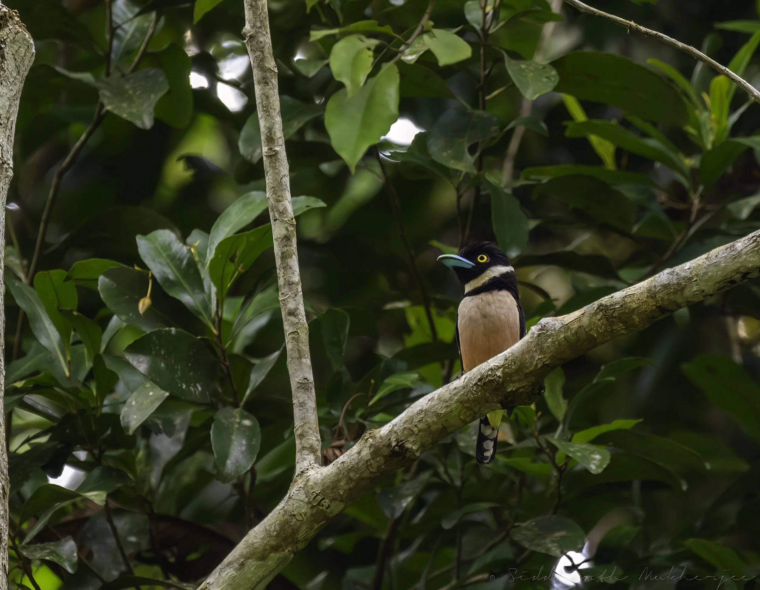 The Black-and-Yellow broadbill (Eurylaimus ochromalus) is a species of bird in the typical broadbill family Eurylaimidae. A small, distinctive species, it has a black head, breastband, and upperparts, a white neckband, yellow streaking on the back and wings, and vinous-pink underparts that turn yellow towards the belly. The beak is bright blue, with a green tip to the upper mandible and black edges. It shows some sexual dimorphism, with the black breastband being incomplete in females.