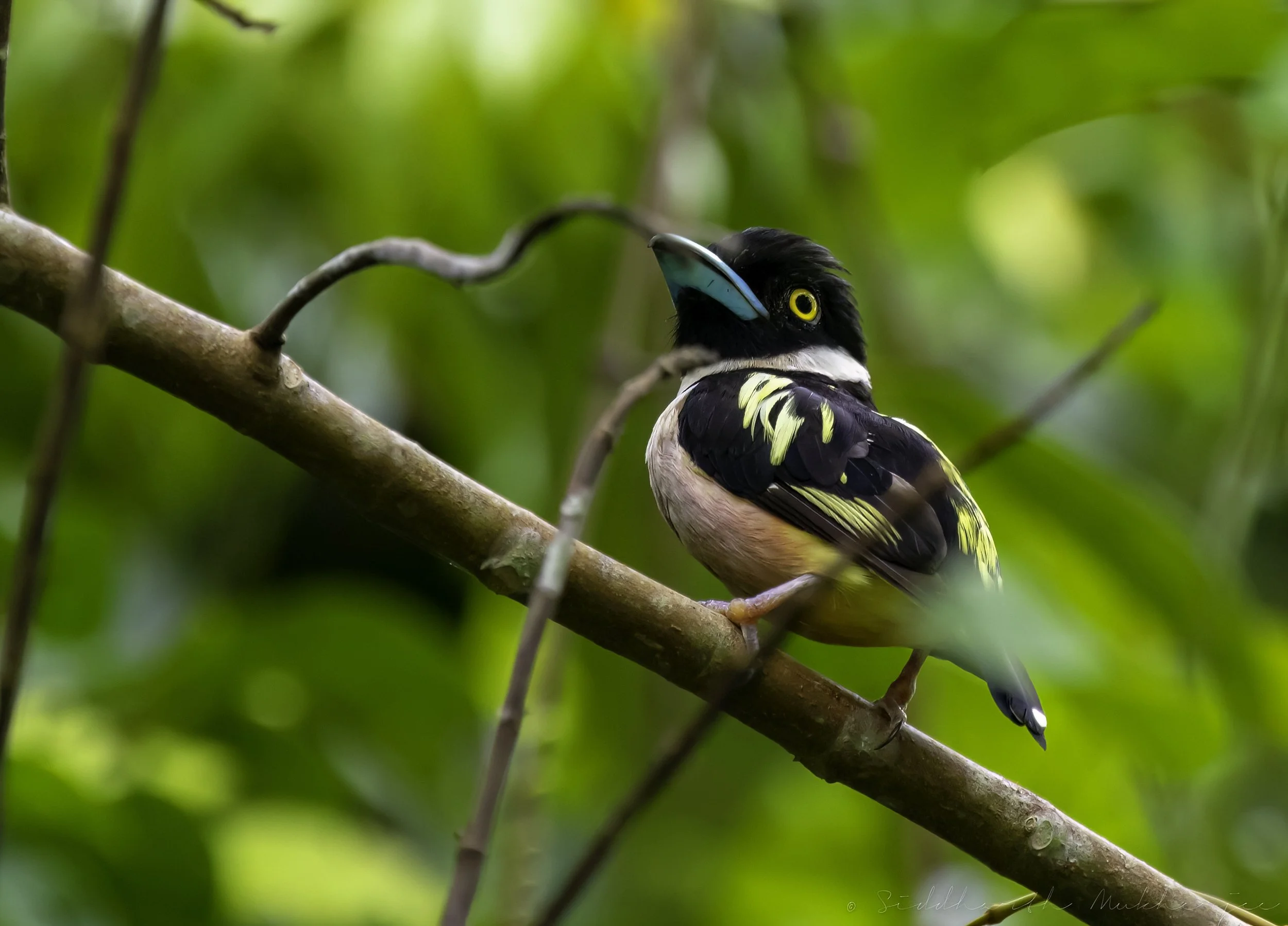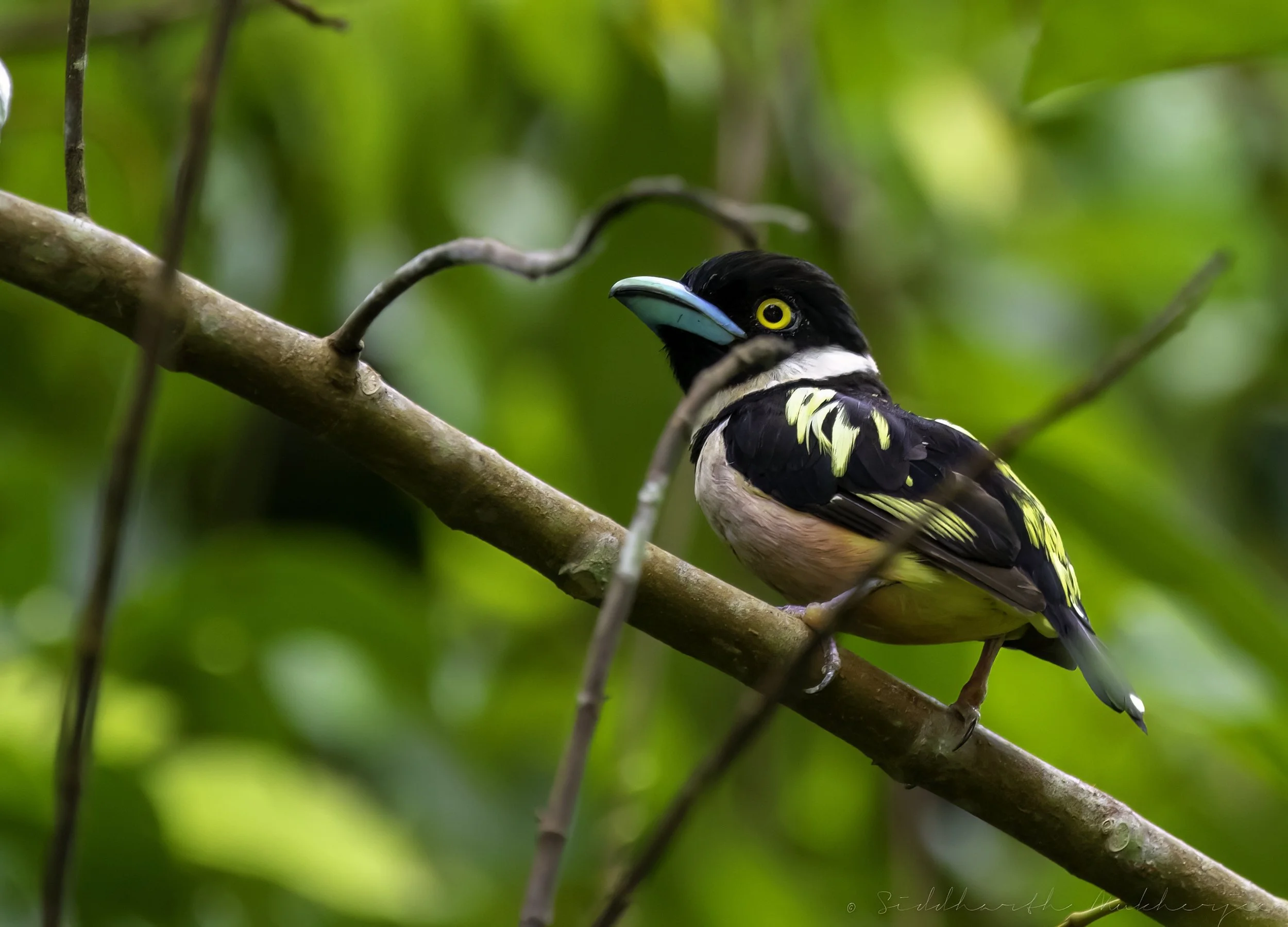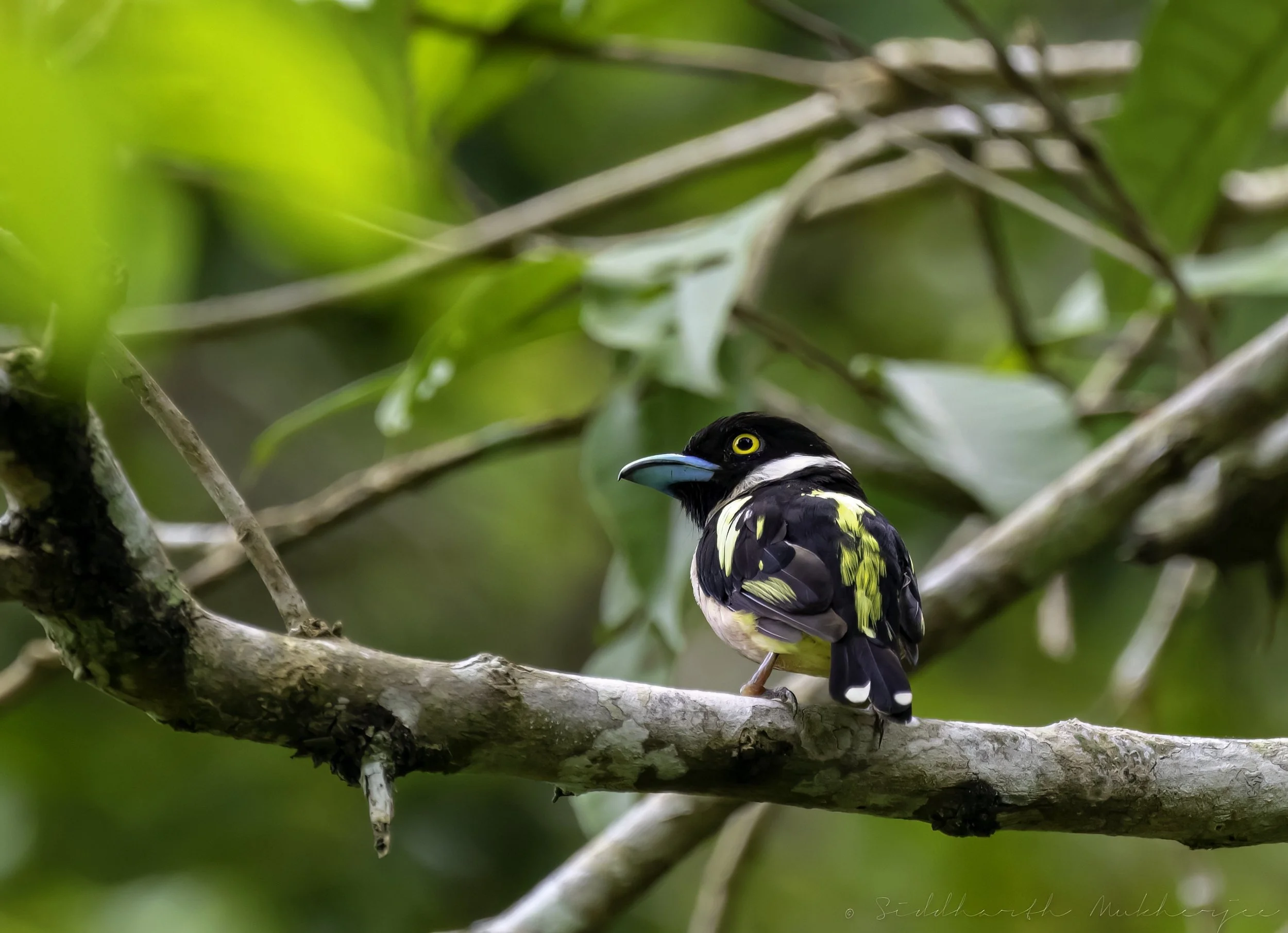 The Black-and-Yellow broadbill (Eurylaimus ochromalus) is a species of bird in the typical broadbill family Eurylaimidae. A small, distinctive species, it has a black head, breastband, and upperparts, a white neckband, yellow streaking on the back and wings, and vinous-pink underparts that turn yellow towards the belly. The beak is bright blue, with a green tip to the upper mandible and black edges. It shows some sexual dimorphism, with the black breastband being incomplete in females.