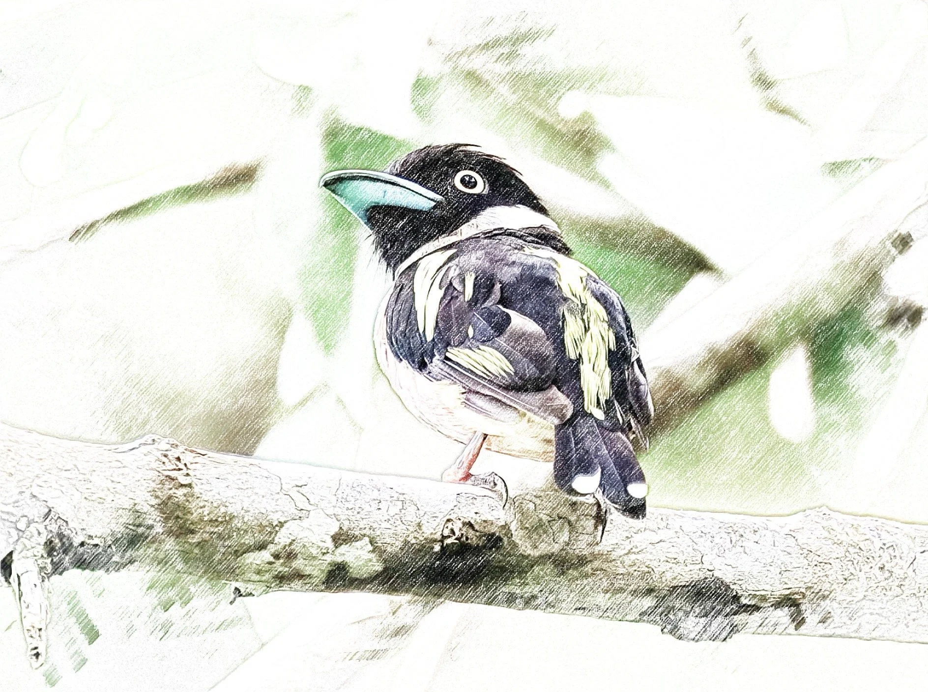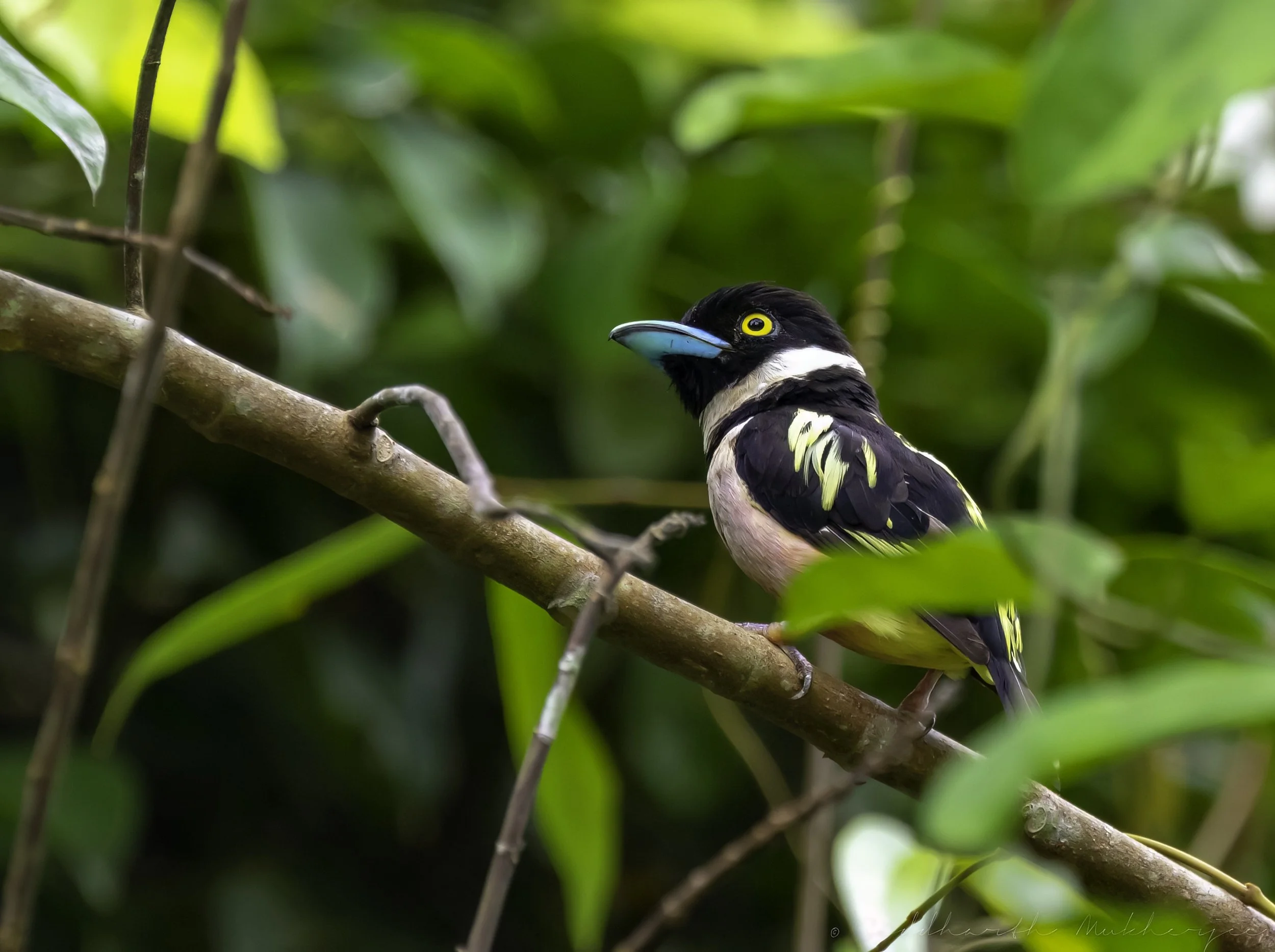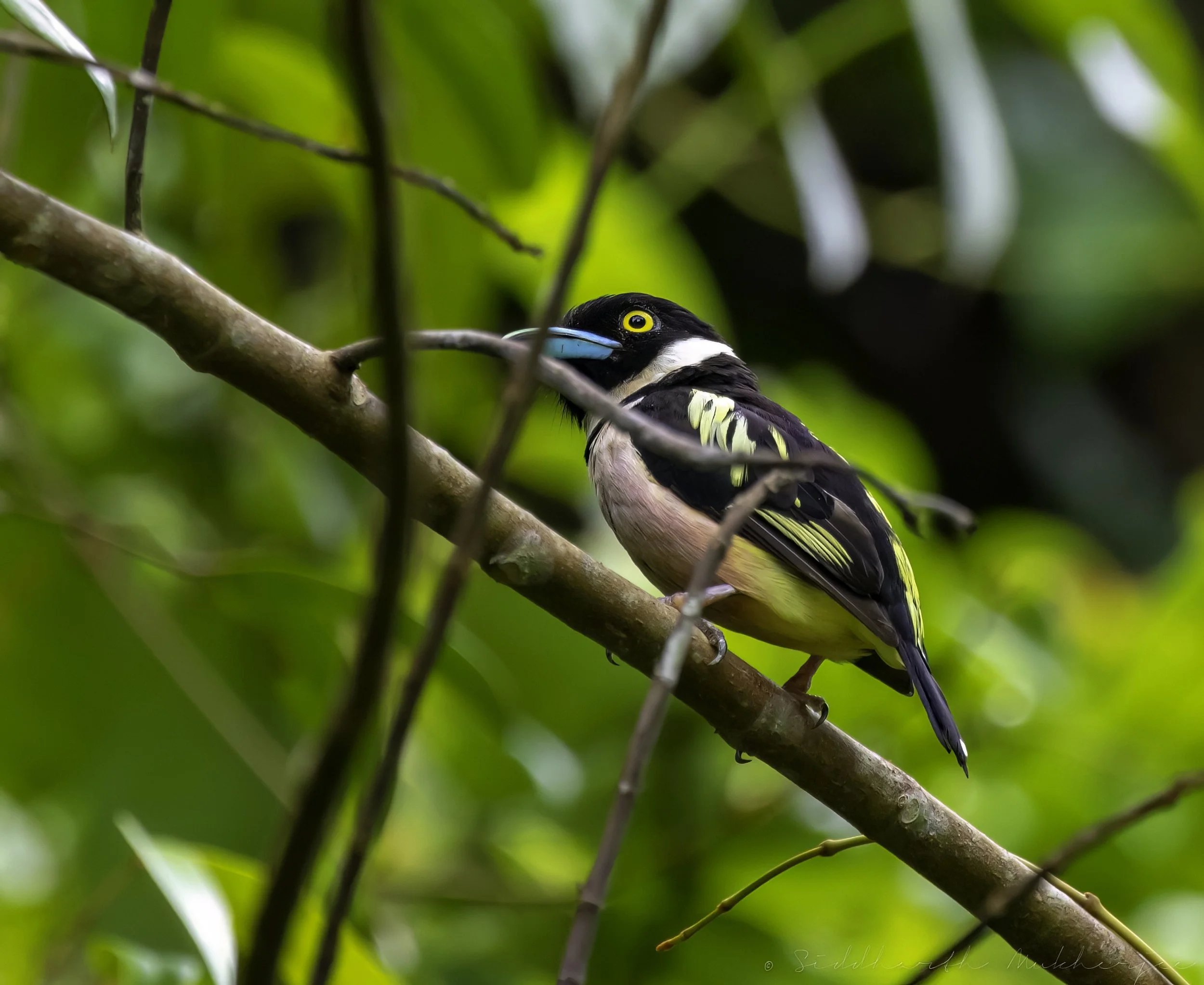 Like other typical broadbills, the Black-and-Yellow broadbill has a large, wide bill that is thought to have first evolved in the common ancestor of all broadbills as an adaptation to an insectivorous diet. Its large and fleshy tongue helps manipulate objects inside its beak, allowing it to mash food against the inside of the beak to "chew" it.