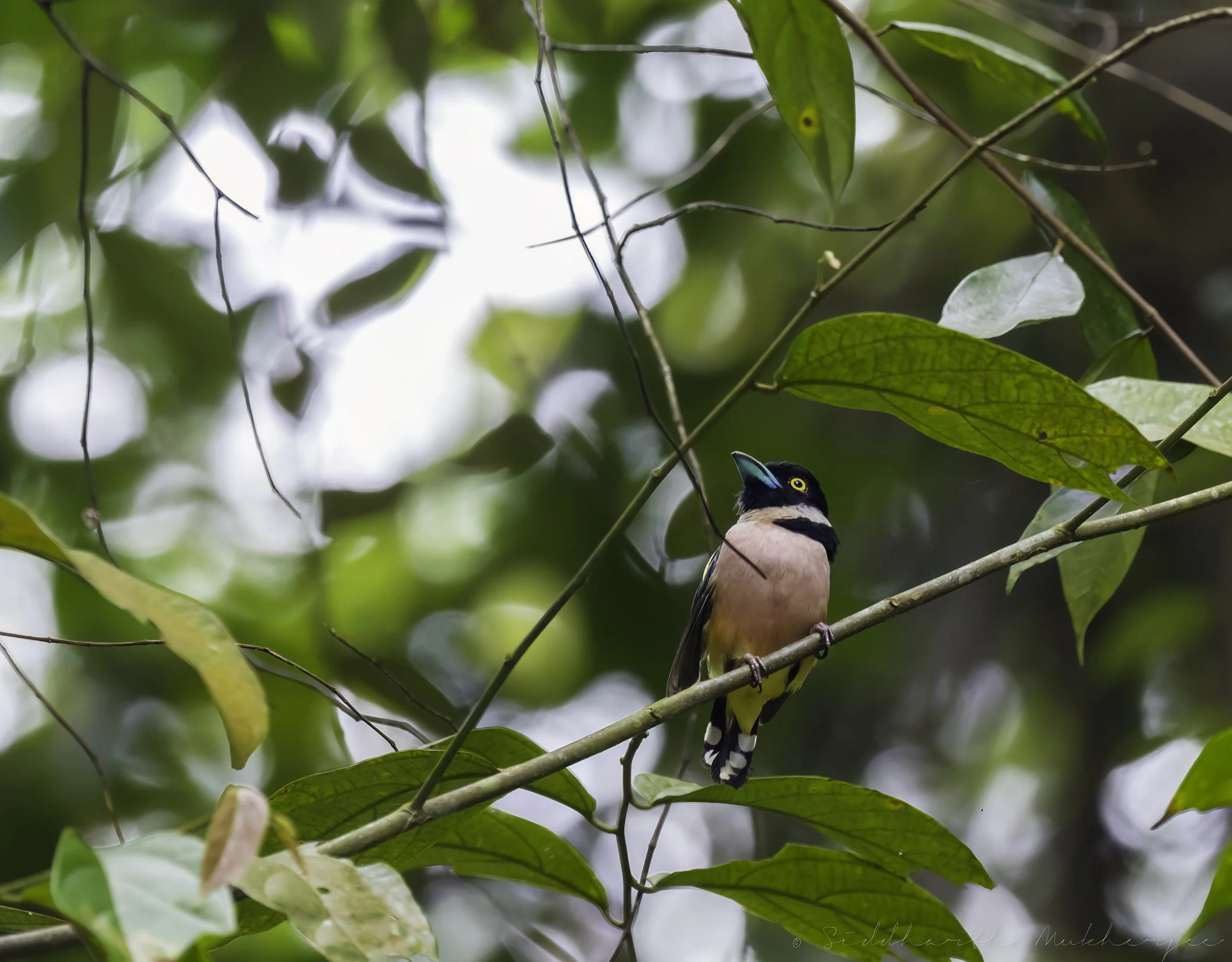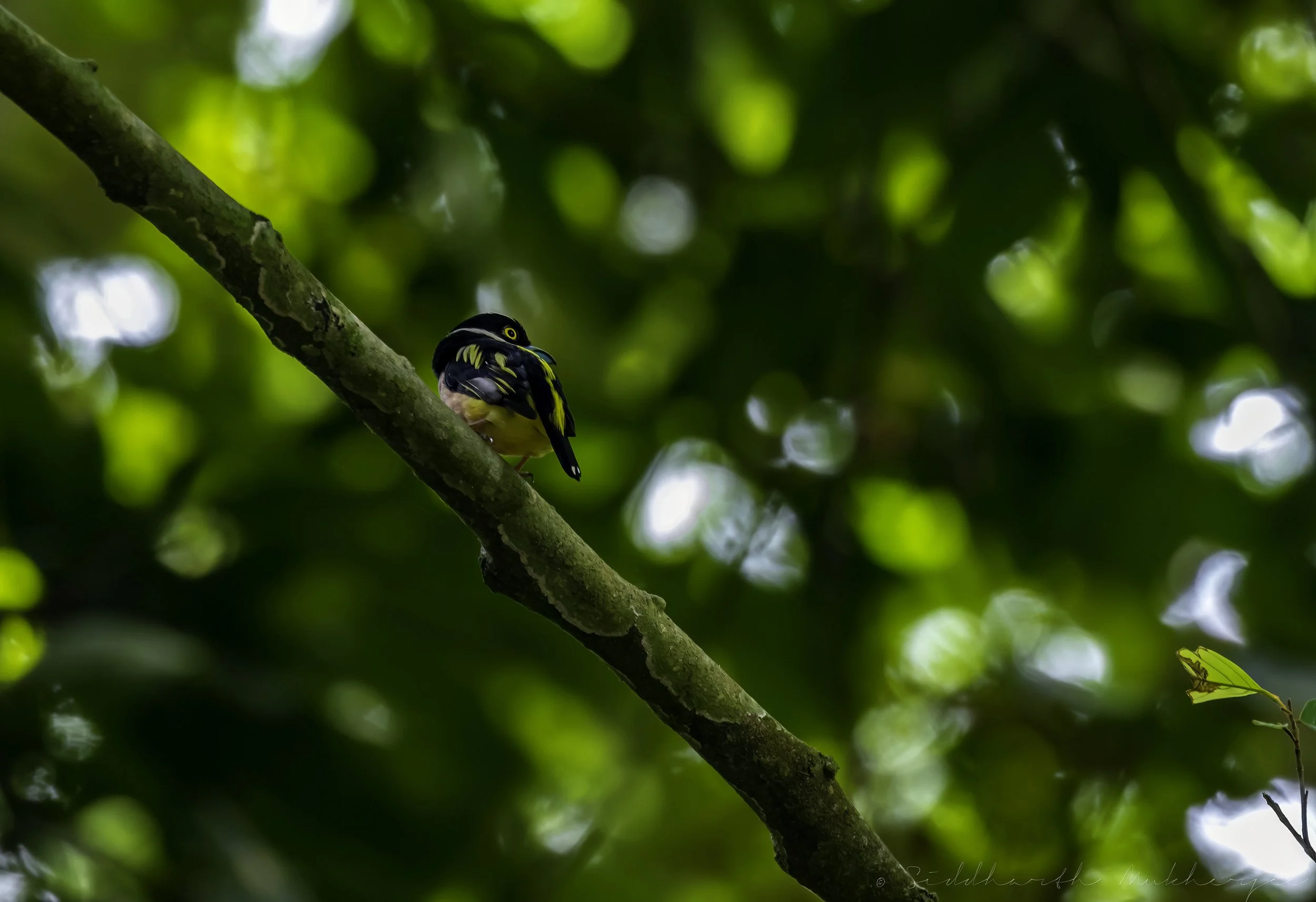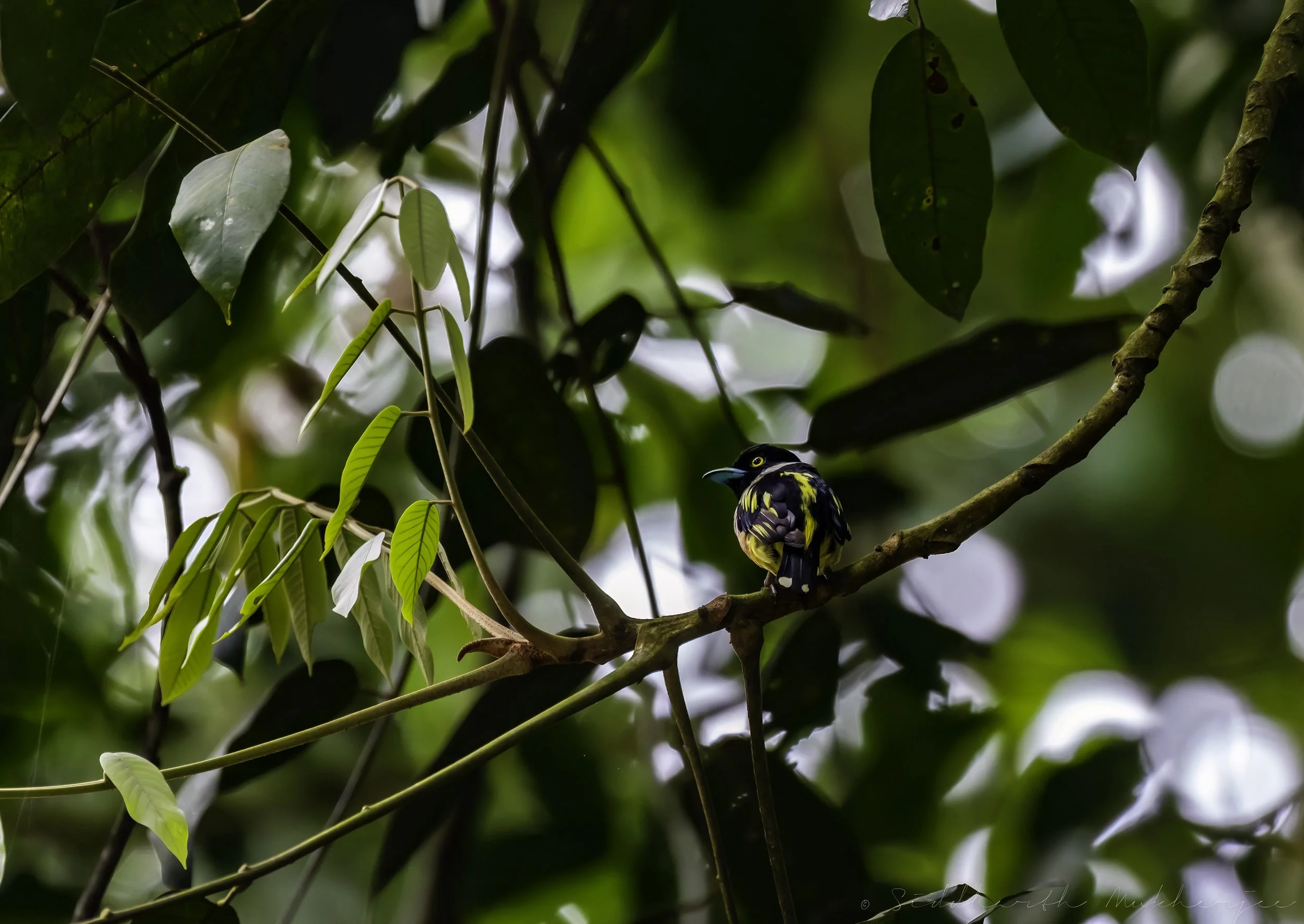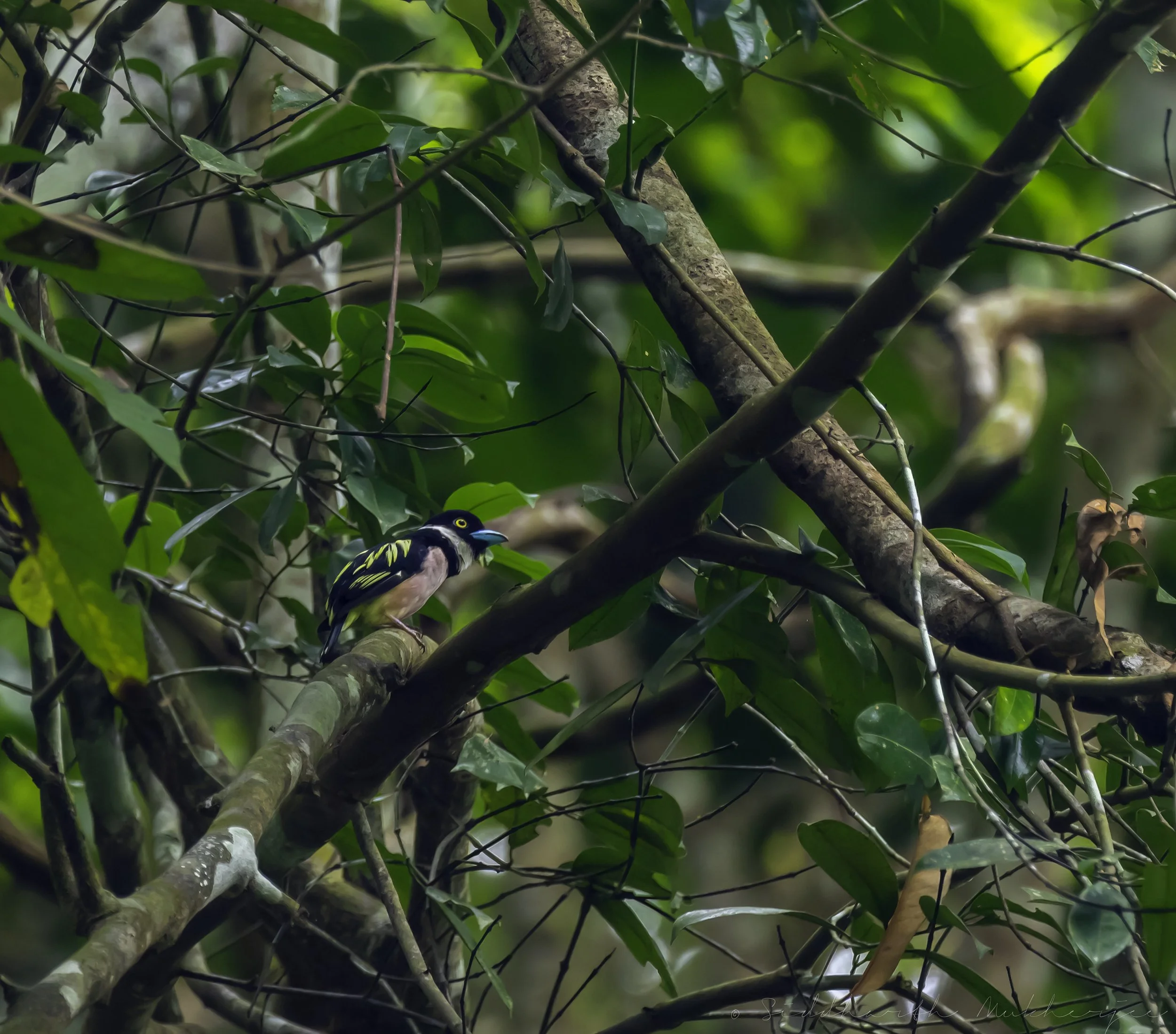 Native to Brunei, Indonesia, Malaysia, Myanmar, Singapore, and Thailand, it inhabits evergreen forest, dipterocarp forest, swamp forest, heath forest, and forest edges, along with secondary forest and plantations that contain large trees. Mainly inhabiting lowlands, the species is found up to elevations of 1,220 m. The black-and-yellow broadbill is mainly insectivorous, but also feeds on molluscs and incidentally takes fruit.