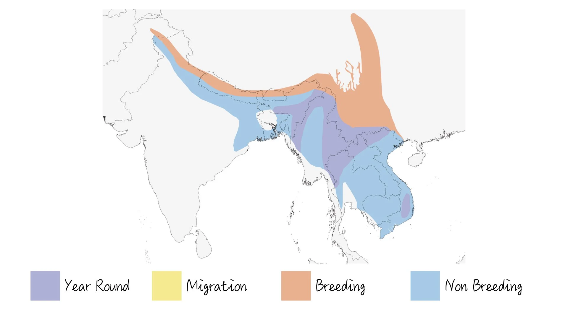 The Blyth's Leaf Warbler's migration is primarily an altitudinal one. Its breeding range is situated in the mid to high-elevation montane forests of the Himalayas, including regions of northern India, Nepal, and China, at altitudes between 1,500 and 3,700 meters. As the weather turns colder, these warblers begin their descent to the lower foothills and adjacent plains to escape the harsh Himalayan winter.