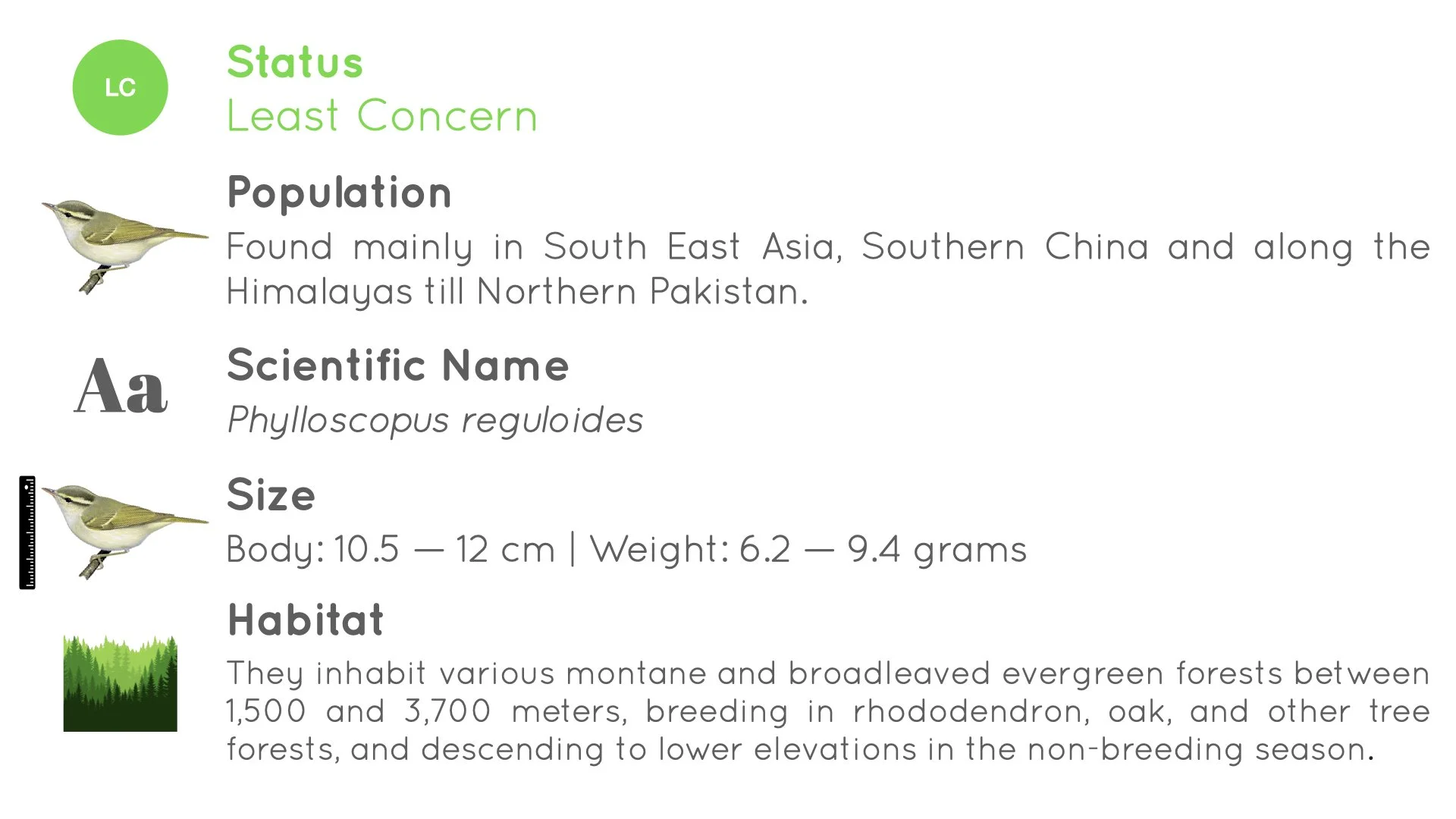 The Blyth’s Leaf Warbler breeds in Rhododendron (Rhododendron) and oak (Quercus) forests, also locally in conifer and moist deciduous forests, between 1500 m and 3700 m; in non-breeding season, at lower levels (mostly below 1500 m) in evergreen forest edges, secondary forest, clearings, scrub and bushes in foothills, also edges of cultivation.