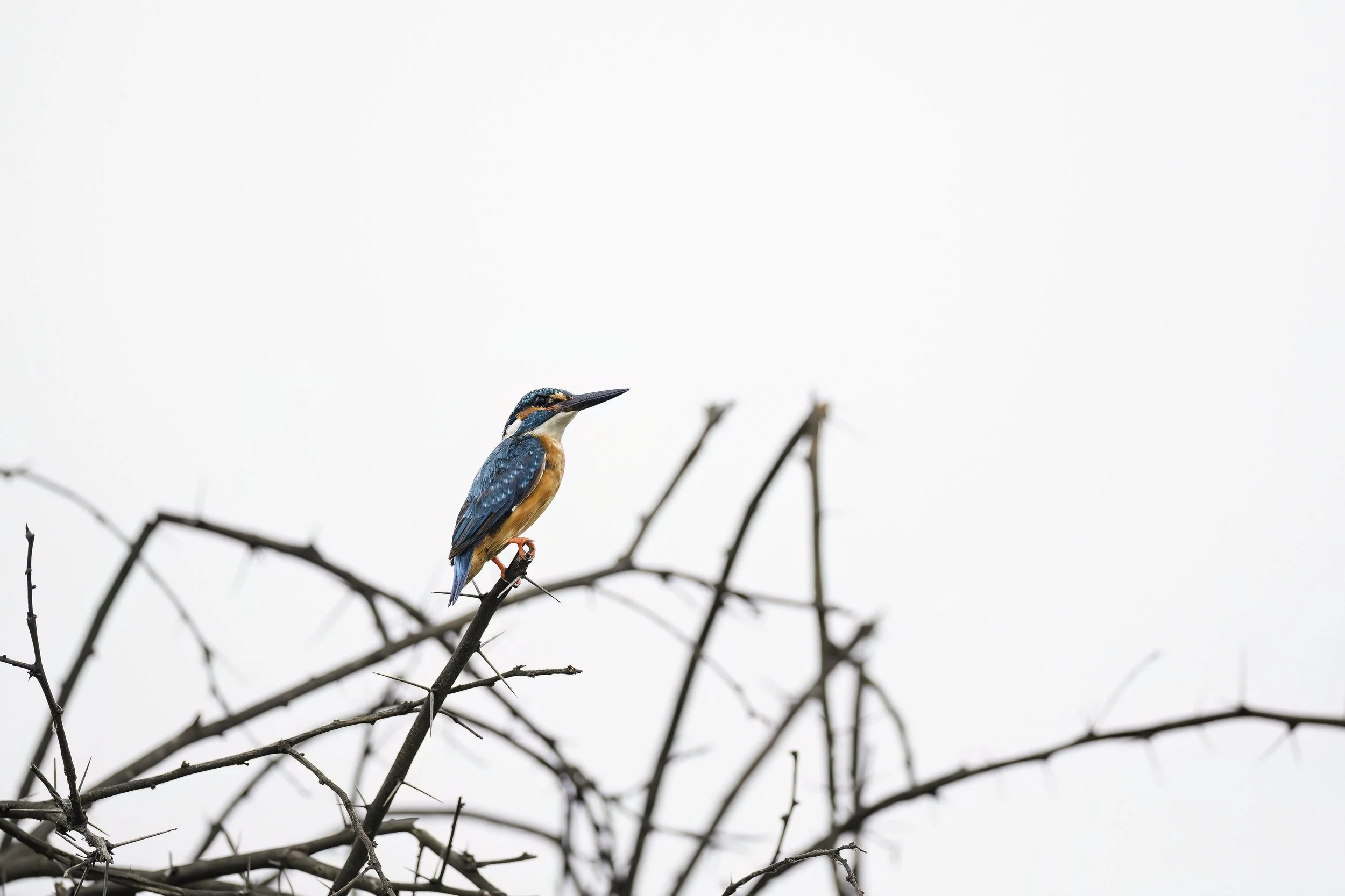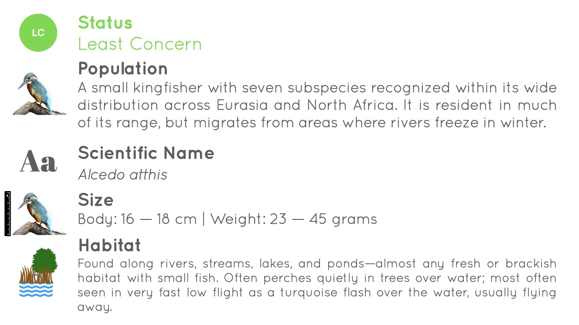 The Common Kingfisher favours still or gently flowing water with plentiful small fish and with reeds, rushes or shrubs on the banks for perches, are essential aspects of the habitat. Streams, small rivers, canals and ditches are preferred compared to open waterbodies, but they also use lakes, ponds and flooded gravel pits. Suitable banks for nesting are required in the breeding season, but nest-sites can be over 250 m from foraging waters. In winter they becomes more coastal, frequenting estuaries, harbours and rocky seashores. In tropical regions, the Common Kingfisher is found in the lower reaches of rivers, often with densely vegetated banks, in creeks in mangroves, at swamps and wet grassland, and in large gardens. In easter parts of their range they come into contact with several other similar species, which may restrict its habitat selection.