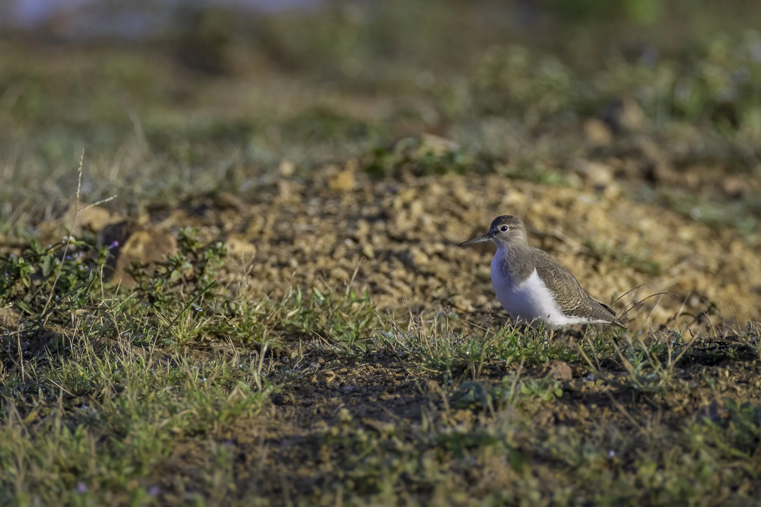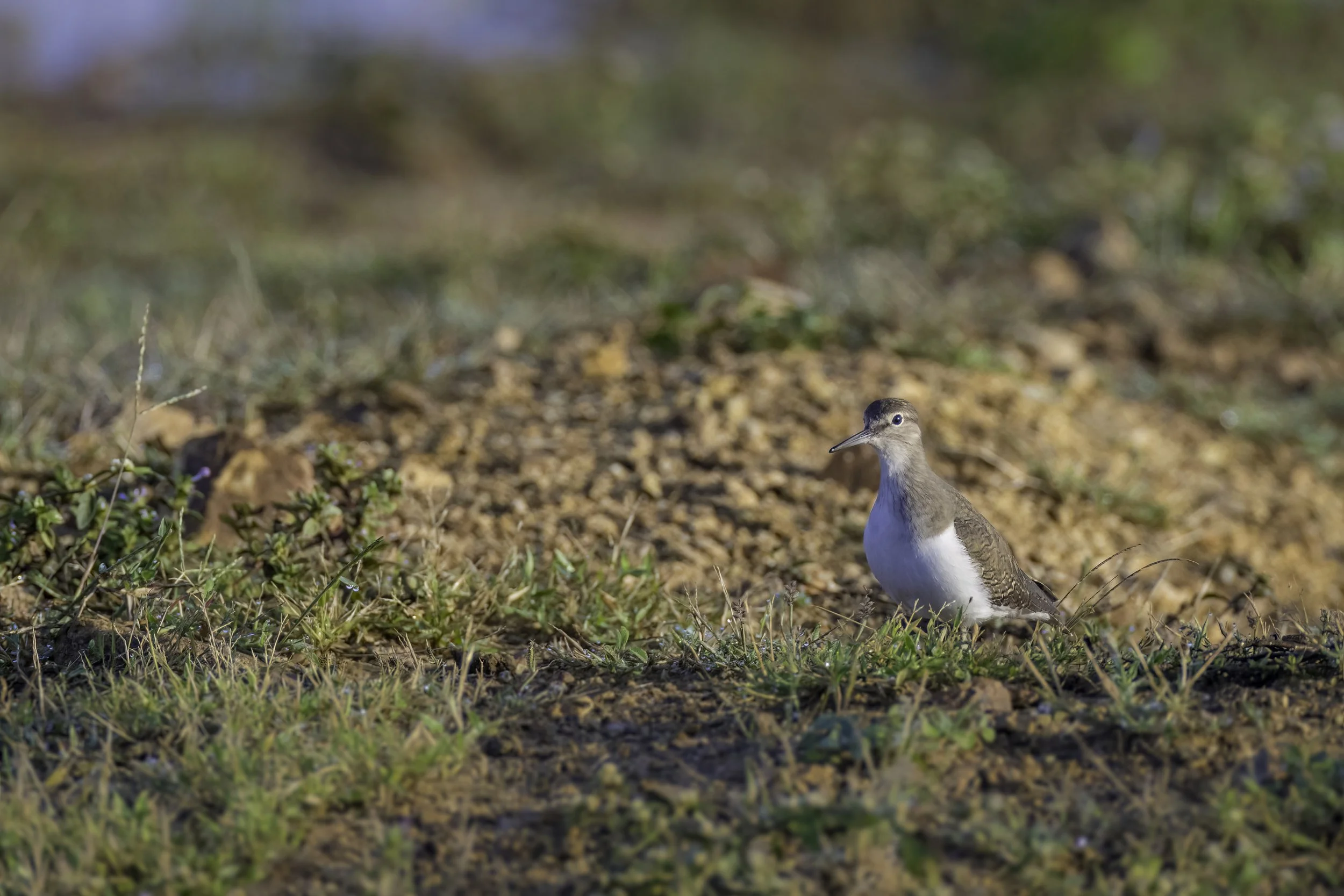 The Common Sandpiper is a small, somewhat long-bodied bird, typically measuring 18-20 cm in length with a wingspan of 32-35 cm. It weighs a mere 40-60 grams, yet is built for impressive, long-distance migration. Its plumage provides excellent camouflage in its varied habitats. The upper parts are a greyish-brown, which contrasts sharply with its bright white underparts, a white spur extending up between the wing and the dark breast patches. It features an indistinct white eye-ring and a short, straight, dark bill with a pale base. Its legs are a short, dark-yellowish color, which helps distinguish it from its American relative, the Spotted Sandpiper (Actitis macularia). In flight, the bird reveals a dark rump and conspicuous white wing-bars, a key identification feature for birdwatchers.