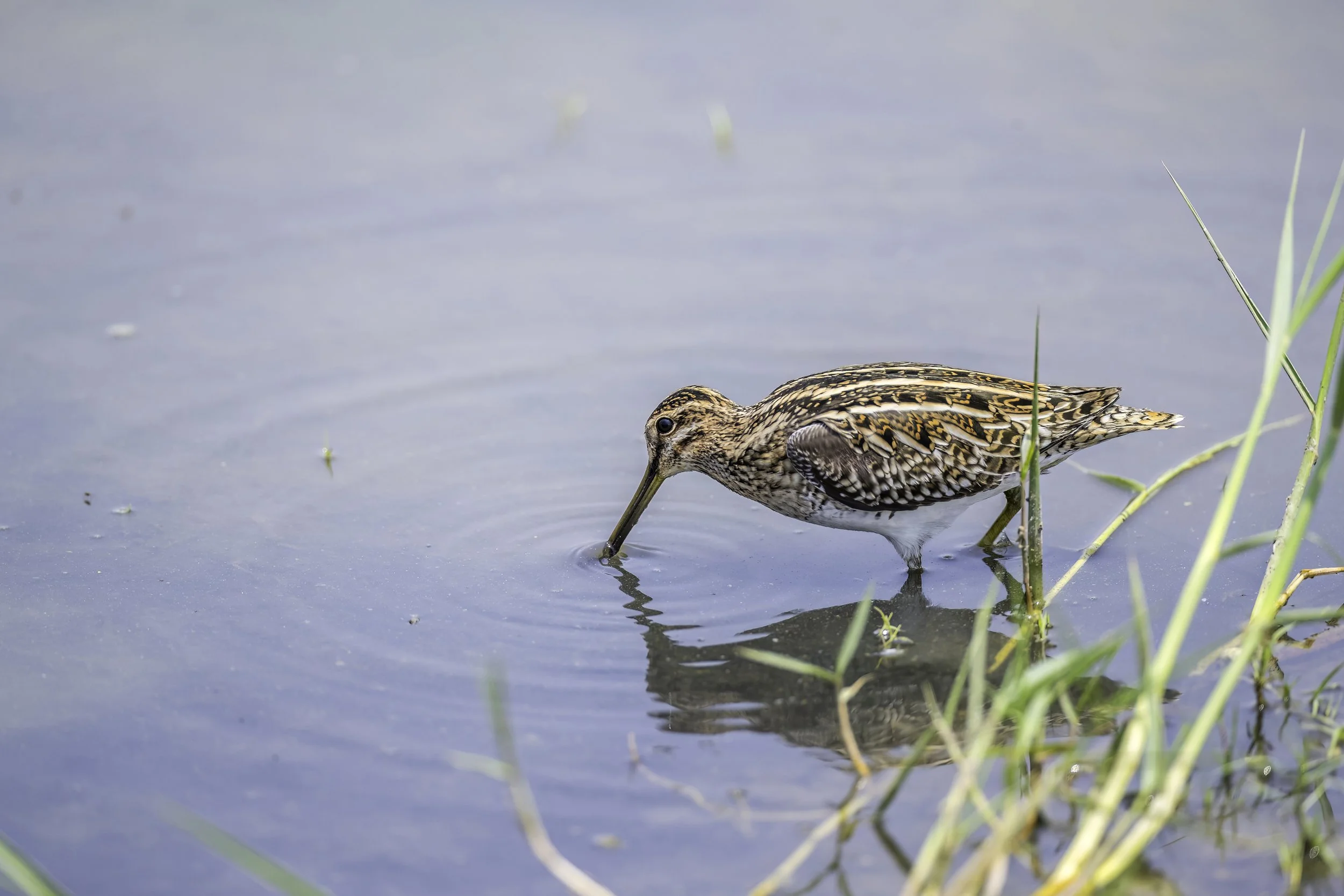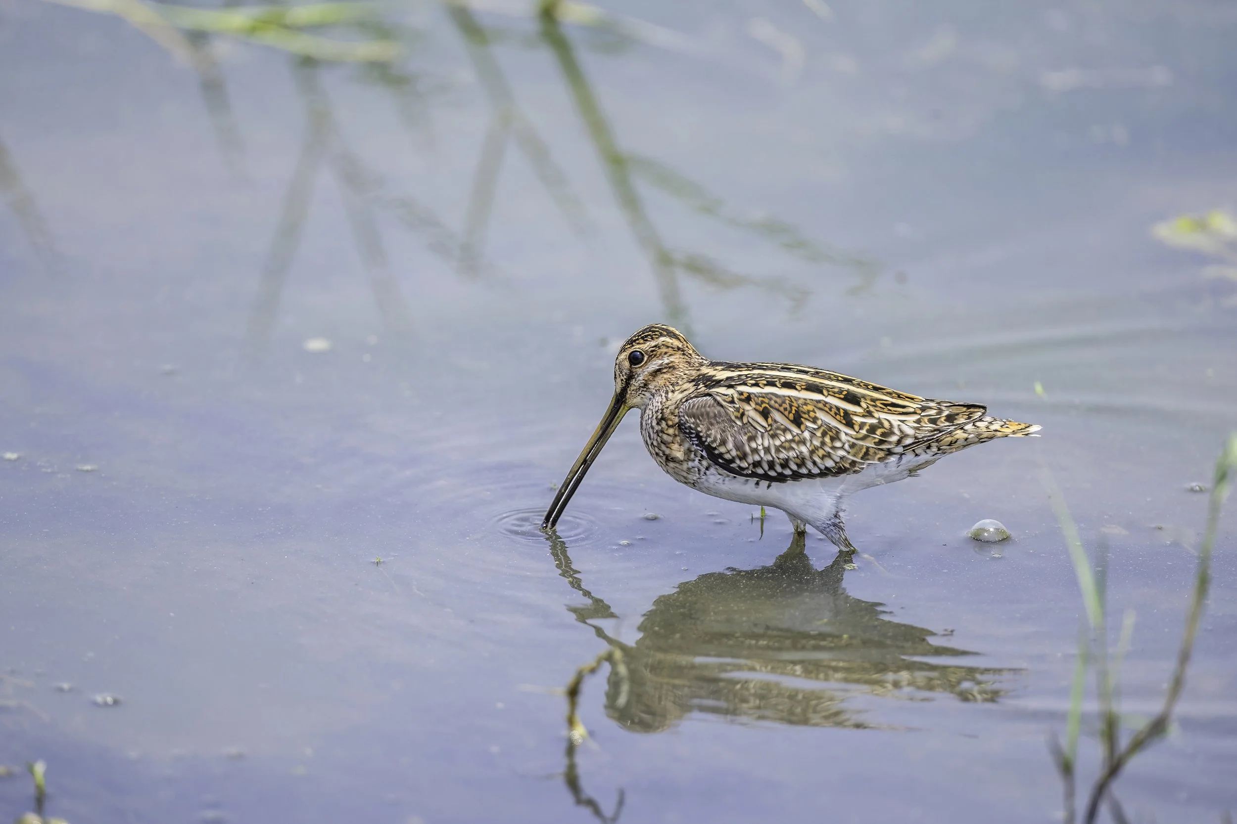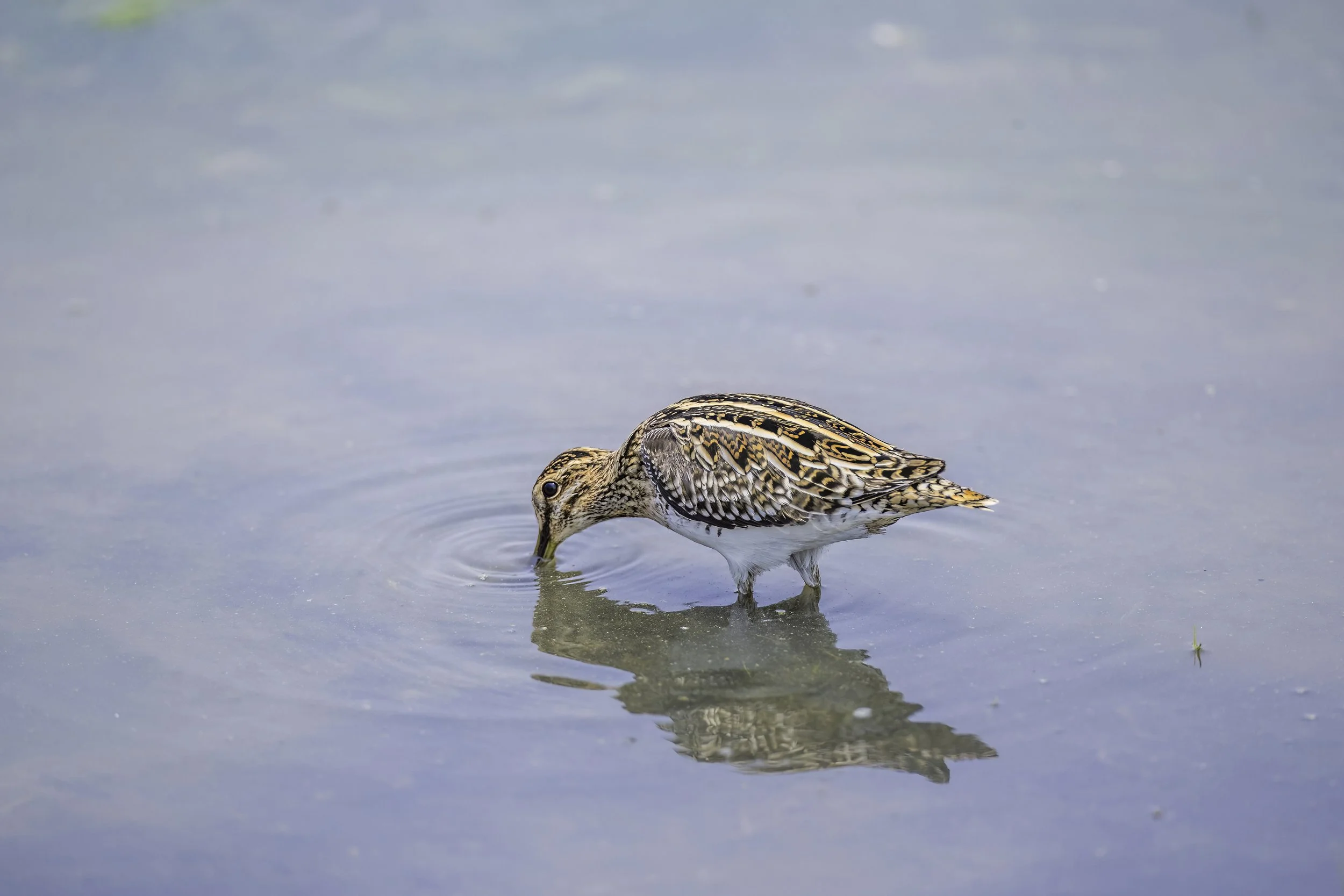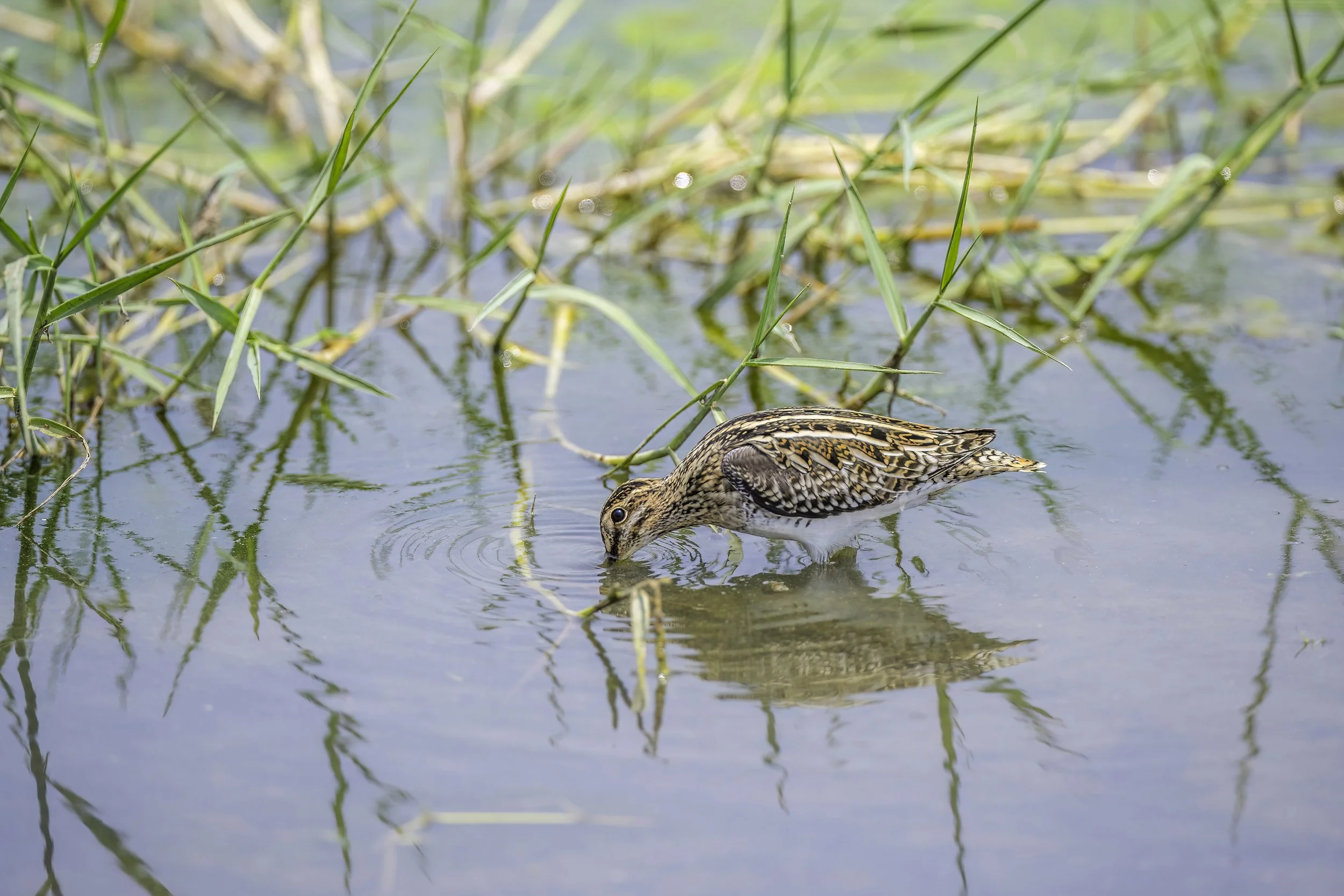 The Common Snipe is a well camouflaged bird, it is usually shy and conceals itself close to ground vegetation and flushes only when approached closely. When flushed, they utter a sharp note that sounds like scape, scape and fly off in a series of aerial zig-zags to confuse predators. They forage in soft mud, probing or picking up food by sight. They mainly eat insects and earthworms, also some plant material.