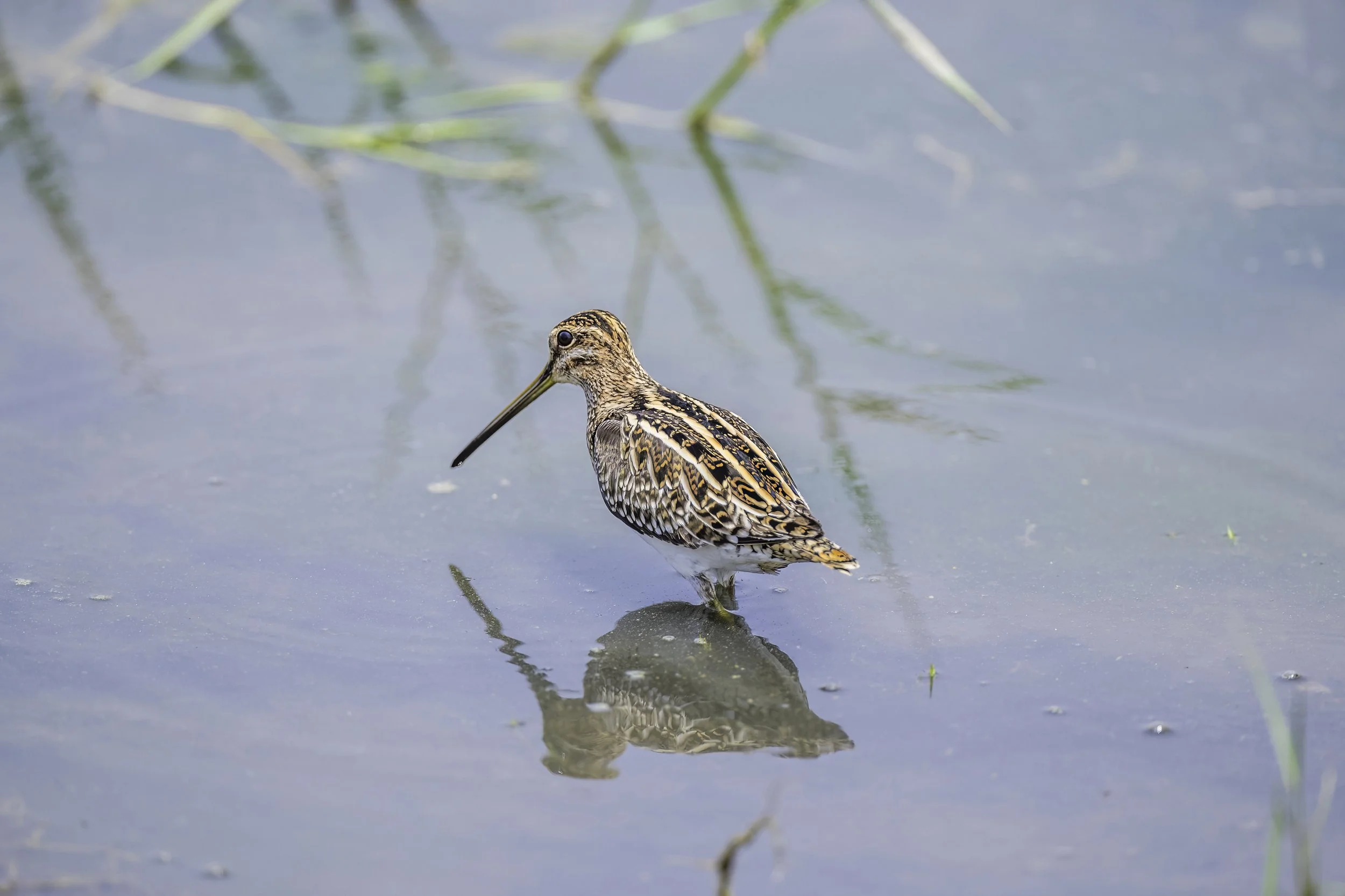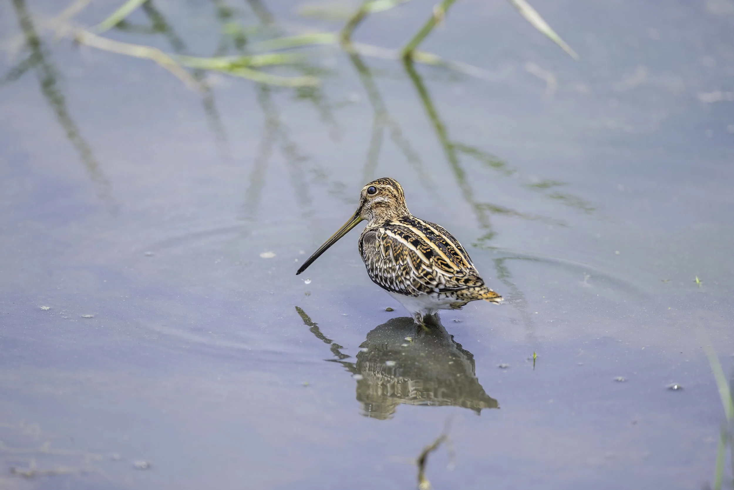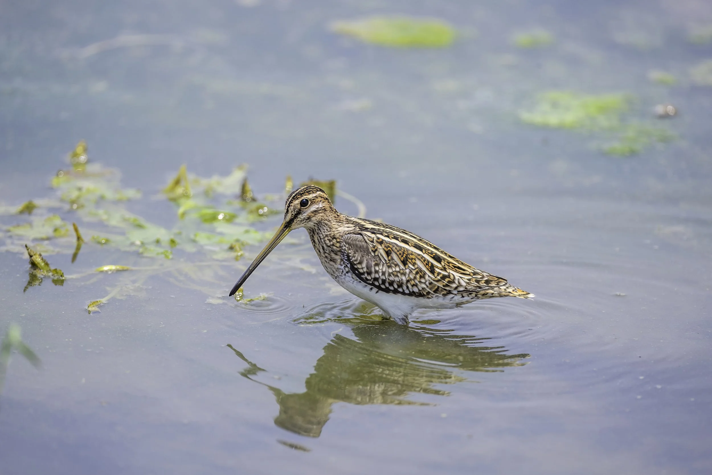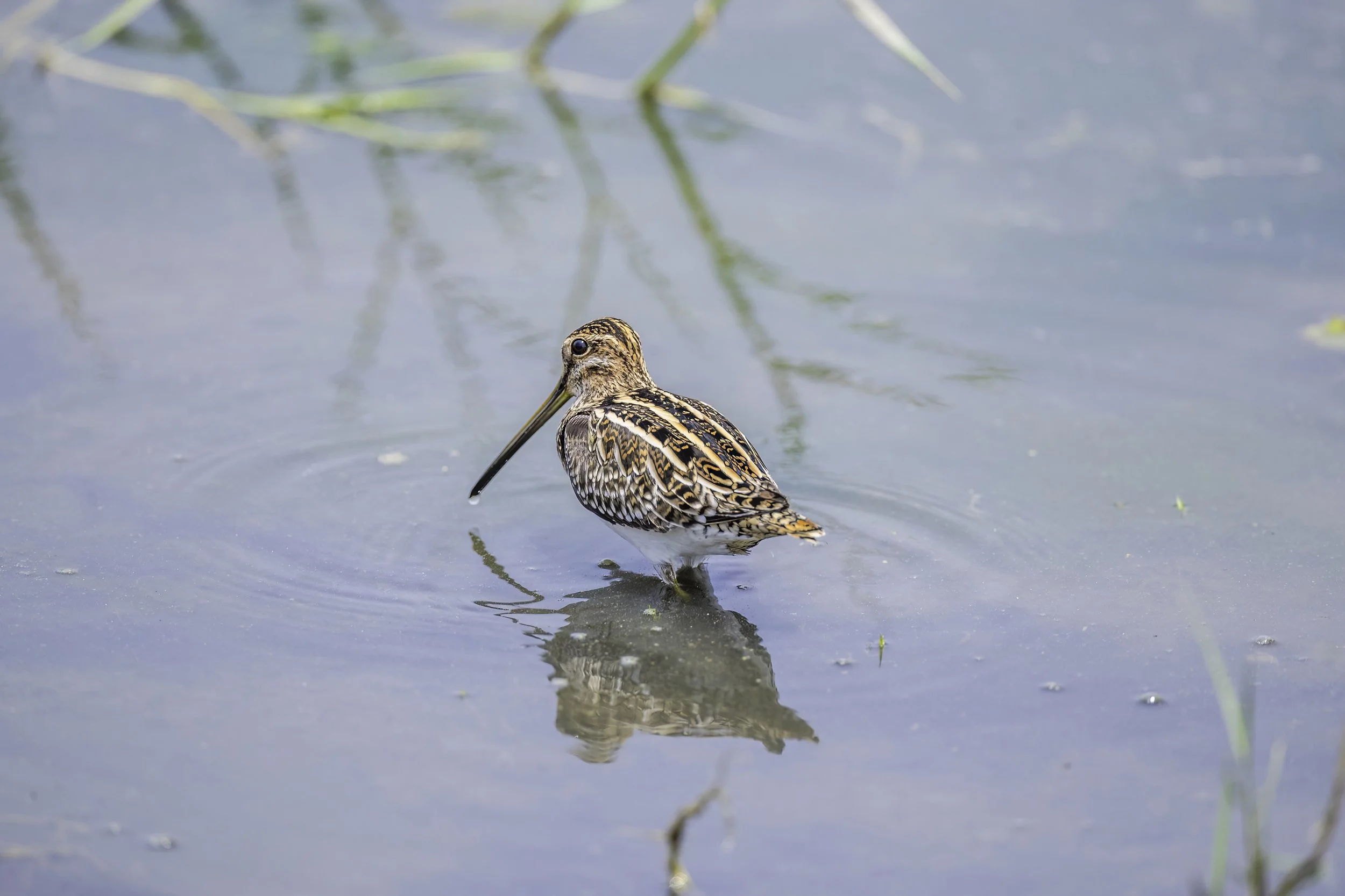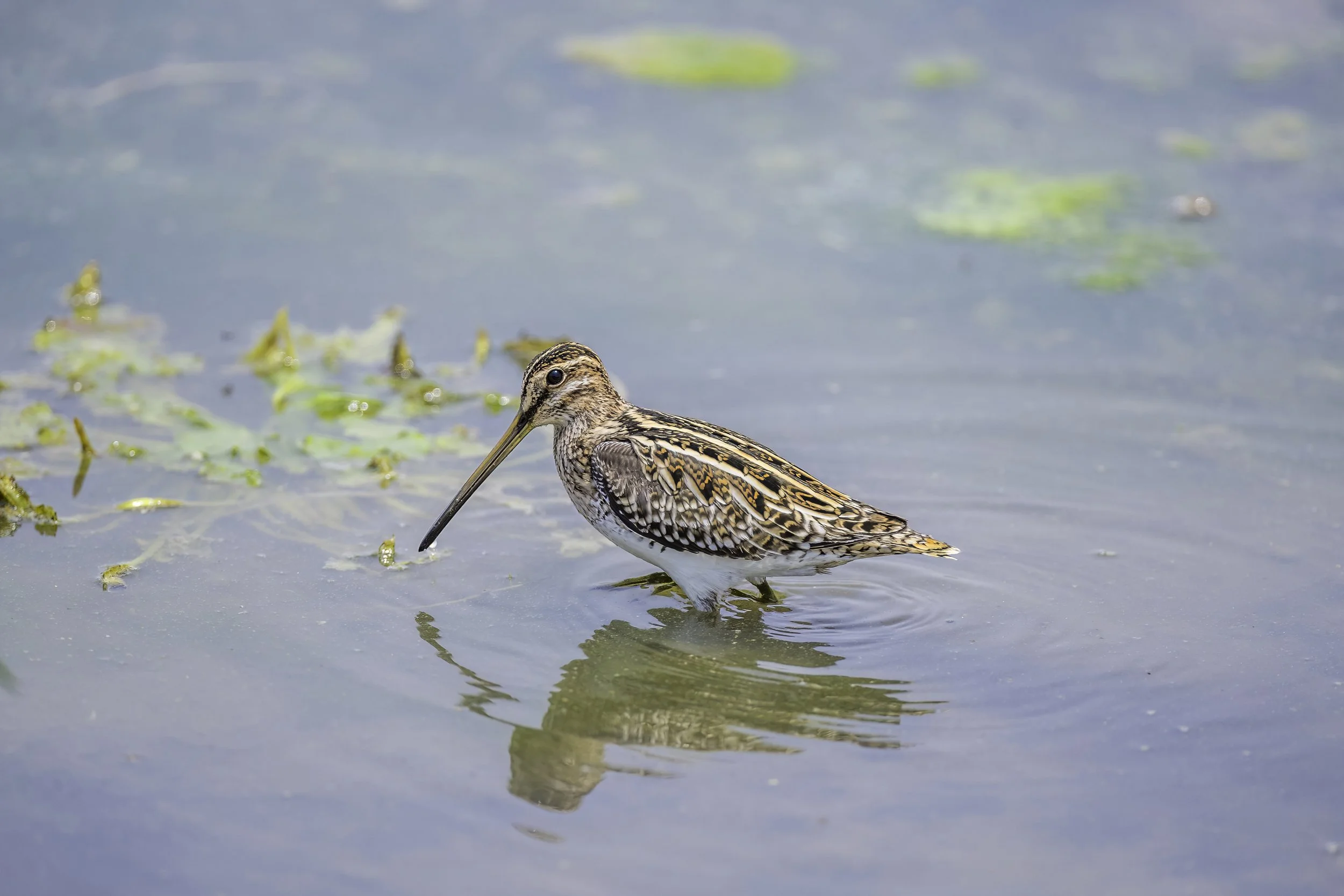 Snipes can be found in various types of wet marshy settings including bogs, swamps, wet meadows, and along rivers, coast lines, and ponds. Snipes avoid settling in areas with dense vegetation, but rather seek marshy areas with patchy cover to hide from predators. The Common Snipe favour breeding habitats like marshes, bogs, tundra and wet meadows throughout the Palearctic. In the north, the distribution limit extends from Iceland over the north of the British Isles and northern Fennoscandia, where it occurs at around 70°N, as well as through European Russia and Siberia. Here it is mostly on the northern edge of the Taiga zone at 71°N, but reaches 74°N on the east coast of the Taymyr Peninsula. In the east it extends to Anadyr, Kamchatka, Bering Island and the Kuril Islands, The southern boundary of the distribution area in Europe runs through northern Portugal, central France, northern Italy, Bulgaria, and Ukraine, with populations in the west being only very scattered. In Asia, the distribution extends south to northern Turkestan, locally to Afghanistan and the Middle East, through the Altai and further to Manchuria and Ussuri. It is migratory, with European birds wintering in southern and western Europe and Africa (south to the Equator), and Asian migrants moving to tropical southern Asia. The common snipe breeds from Alaska to Newfoundland south to the mid-United States. It winters north from northern South America to British Columbia, the northern Gulf states and Virginia. It is also found in Europe, Northern Africa and Asia.