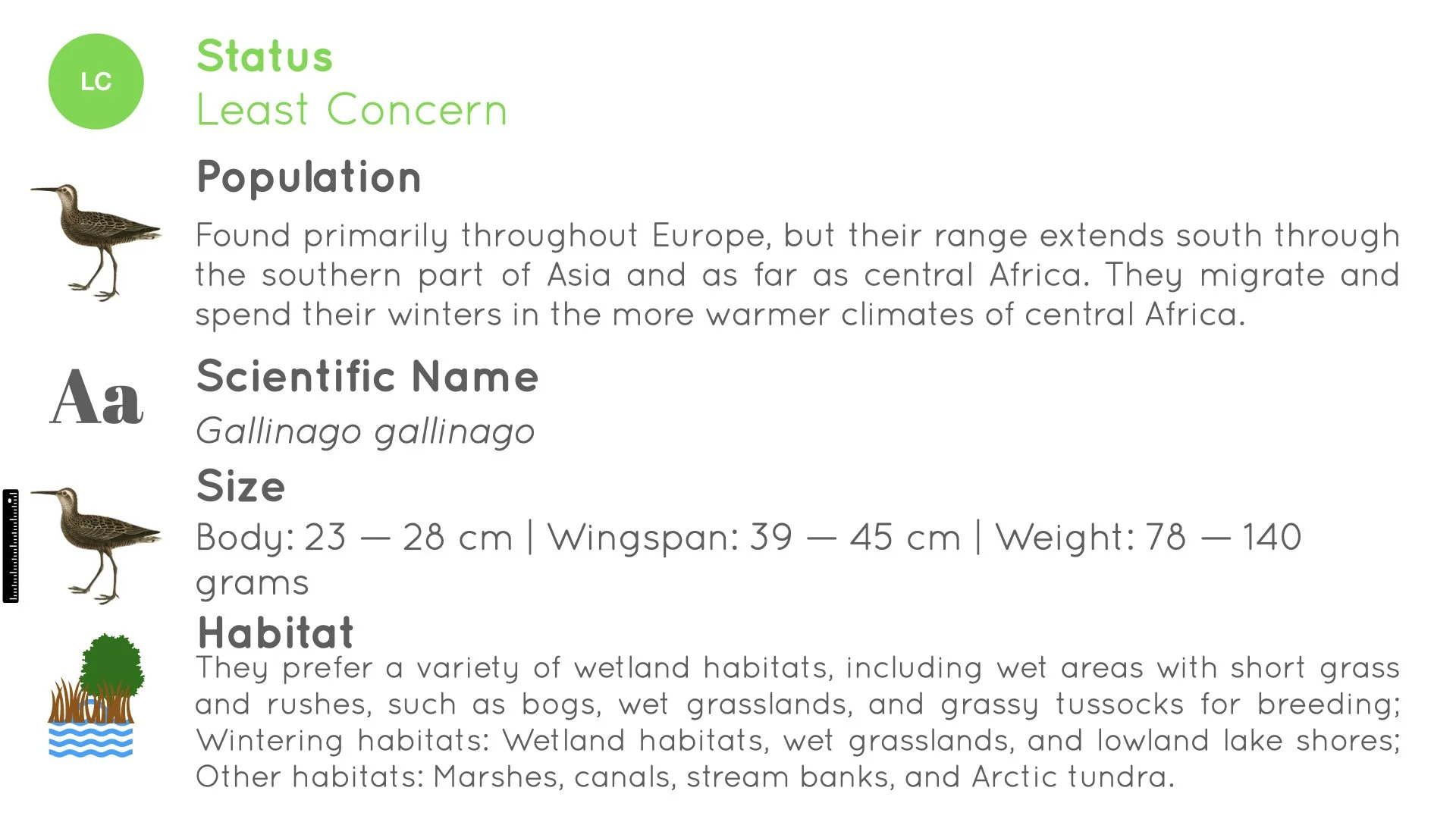 Gallinago gallinago gallinago (Linnaeus, 1758) – nominate subspecies; breeds in central, north Europe and Asia; non-breeding in west Europe, Africa, Indonesia and Japan