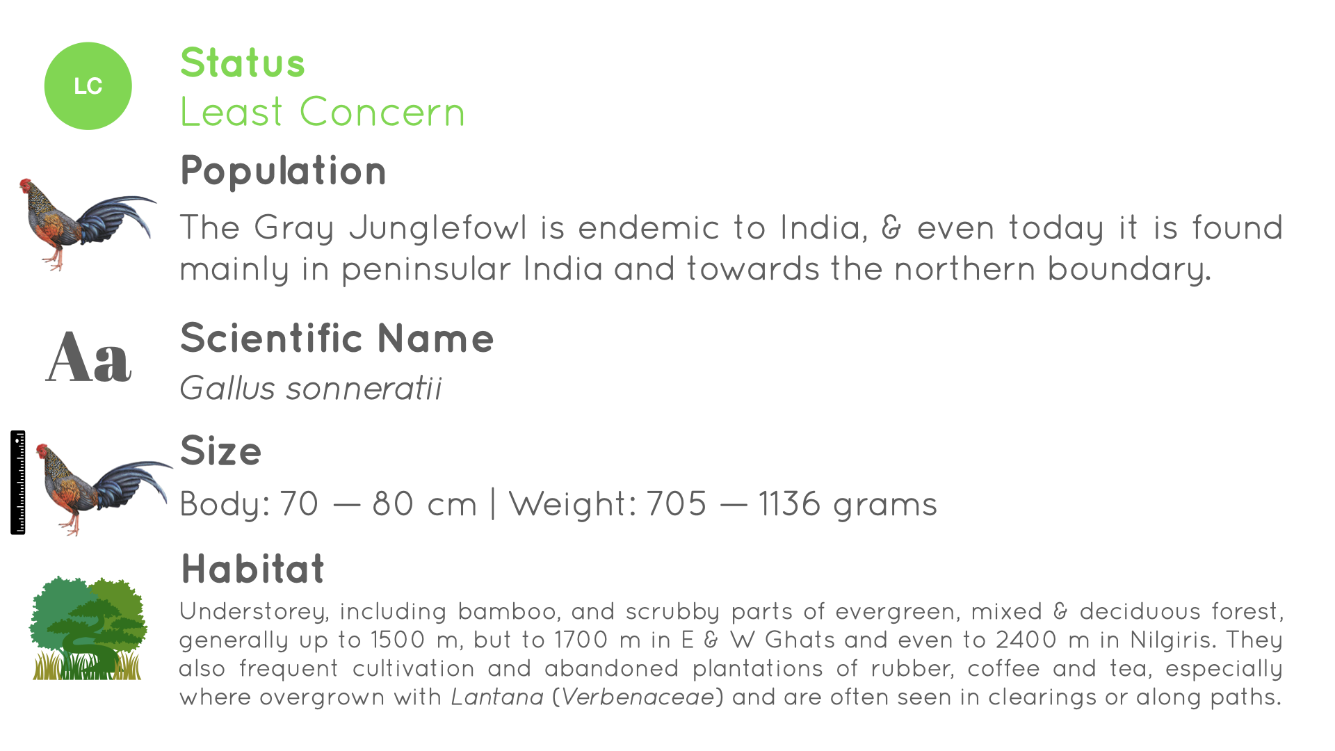 The Gray Junglefowl is not globally threatened and therefore classified as Least Concern. Mace Lande: vulnerable. CITES II. Formerly considered Near Threatened. There is preciously little information on the status despite extensive distribution. They are believed to be declining, with populations increasingly fragmented, in Kerala at least, where they are protected within the Periyar Tiger Reserve and Satpura National Park. The Gray Junglefowl is threatened by loss of forested habitats to agriculture, which has been ongoing since the 1870s, and also by overgrazing and burning of scrub, especially removal of understorey for fuelwood even within protected areas. They are hunted for food and their eggs are also collected in some areas, and formerly for sport they have apparently been persecuted almost to extinction in some areas, even within several protected areas, e.g. Jessore Sloth Bear Sanctuary. Their hackles are used in fly-fishing, but demand seems to be satisfied from captive birds. They occur in more than ten protected areas in Rajasthan, Madhya Pradesh, Gujarat, Kerala and Tamil Nadu, including Bori, Mount Abu and Anamalais Wildlife Sanctuaries, Vansda, Silent Valley and Eravikulam National Parks, and Kalakad-Mundandurai Tiger Reserve; and Pench and Melghat Tiger Reserves, Maharashtra. Some studies are underway; information required upon which to base management regime. Varied density estimates, e.g. 37·03 ± 2·81 birds/km² in Tamil Nadu, 25·45 ± 3·4 birds/km² in Kalakad-Mundandurai Tiger Reserve, 16·72 ± 4·7 birds/km² in Maharashtra, and 7·87 birds/km² in Deva Vetala National Park and 5·39 birds/ha in Rajaji National Park.