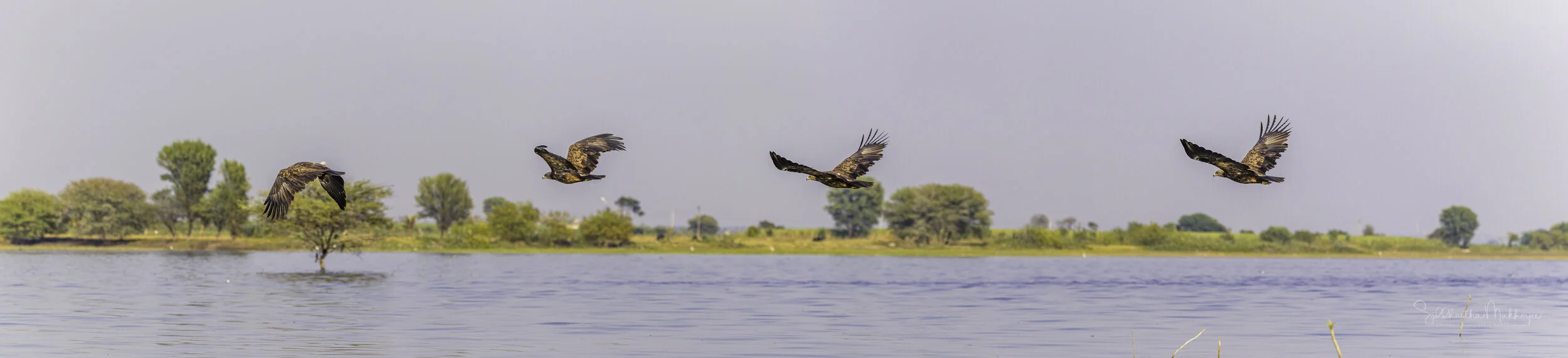 A 4 photo panorama of the Greater Spotted Eagle as it flew away from us in all likelihood to the perch on the same tree it was on in the second photo.