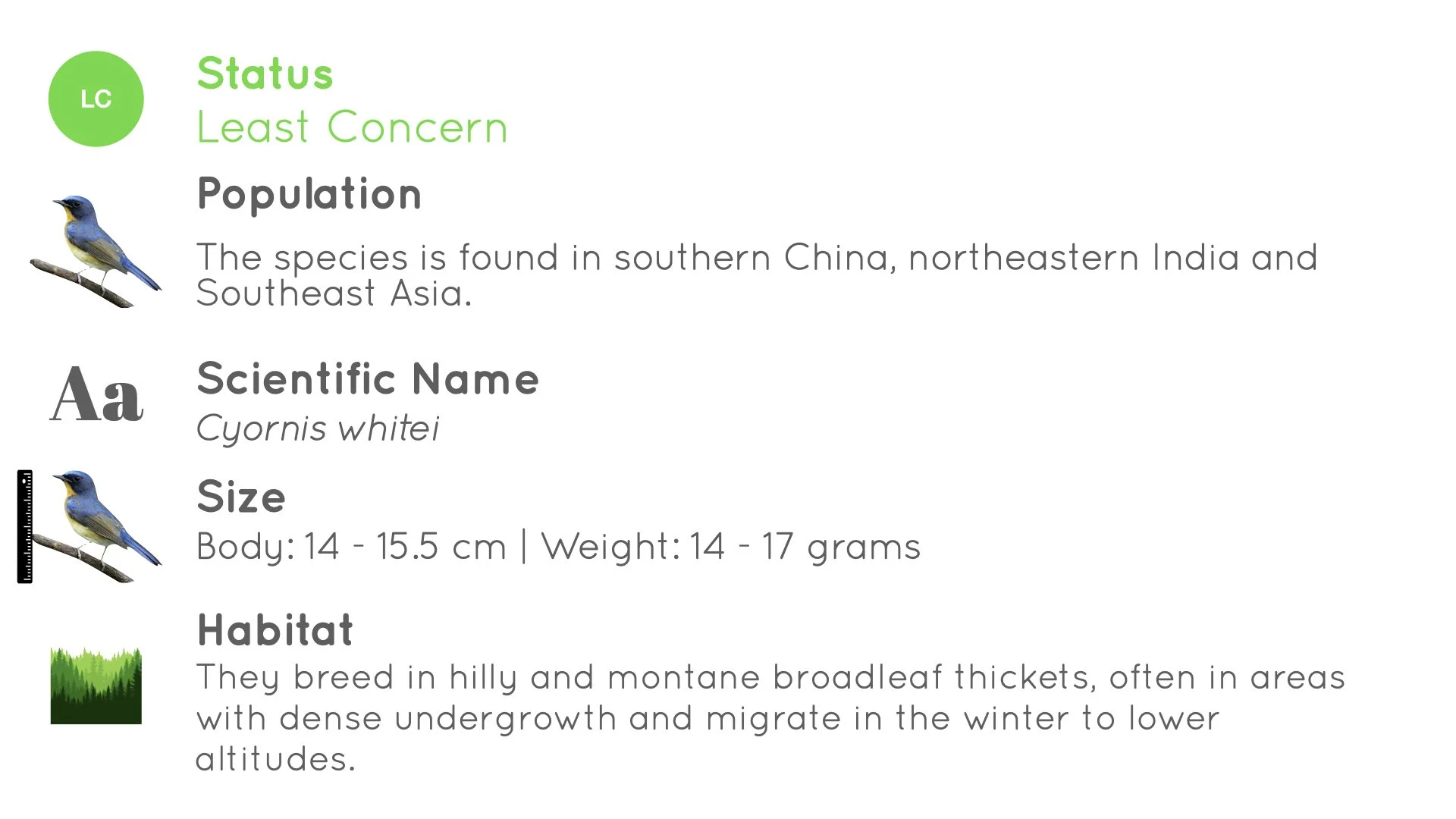 Categorized as globally Least Concern. In Thai-Malay Peninsula, Wells considered it Least Concern, bordering on Near-threatened as it occurs mainly in the forested mountainous regions where habitats are relatively secure. Much of the forested habitats inhabited by Hill Blue Flycatcher in north-eastern India are not protected and largescale deforestation has been documented to take place, particularly northern Cachar (Dima Hasao) and the Lohit and Lower Dibang Valley Districts. It has been recorded on a survey of bird trade in Hong Kong during 1965–1980. Similar taxa such as the Javan Blue Flycatcher (C. banyumas), formerly thought to be specific, has been declining through excessive trapping for bird trade. t is listed as a protected species in Thailand and Malaysia under Wildlife Preservation and Protection Act, B.E. 2535 (1992) and the Wildlife Conservation Act 2010 respectively.