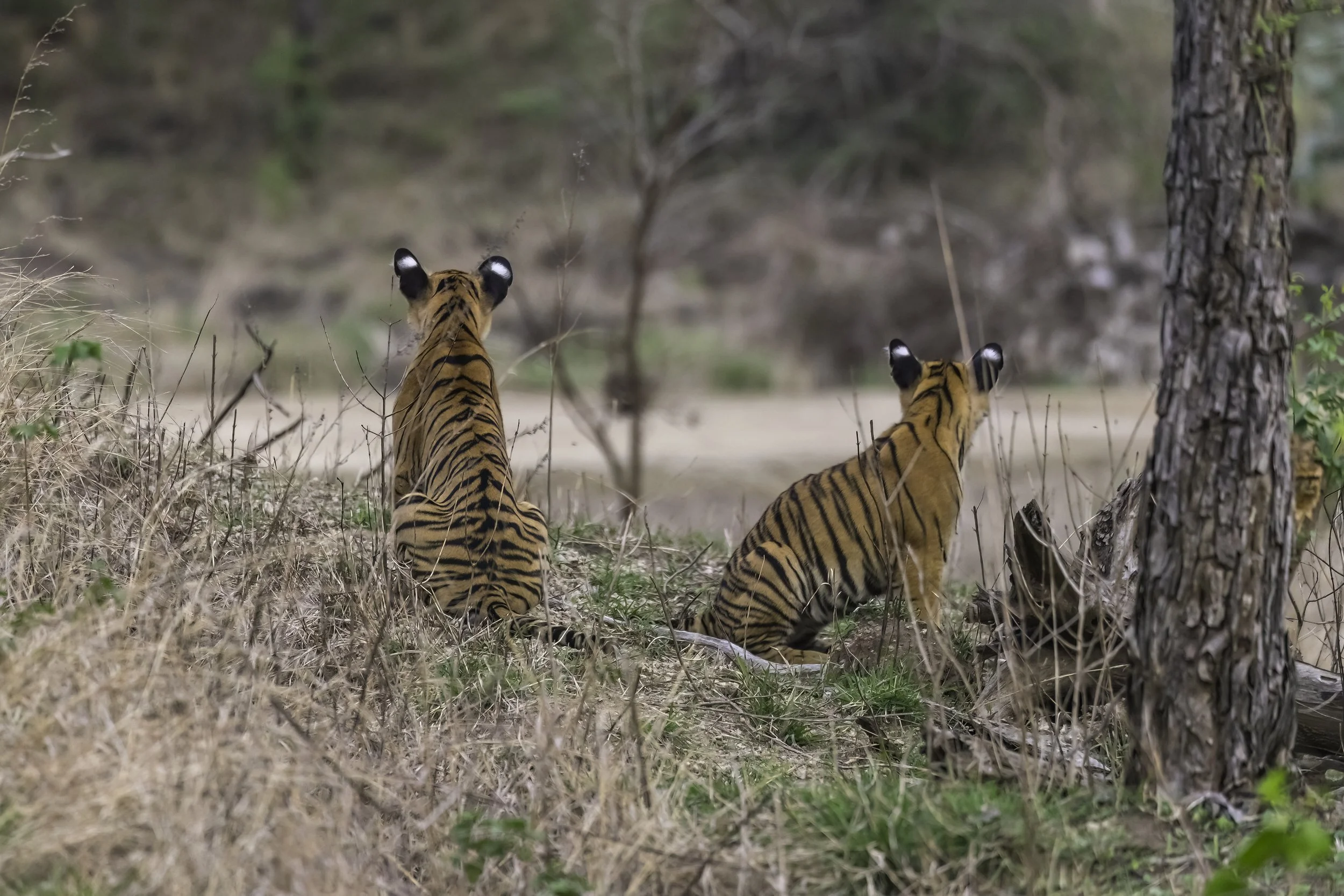 Two of the three cubs from the recent litter of the 4-Mark Tigress of Maregaon watching as the third cub goes exploring. Read about the Meadow Queen of Maregaon