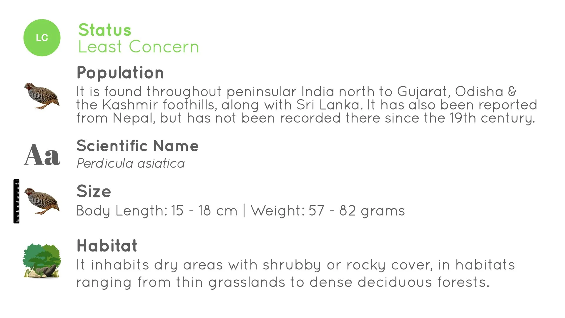 The species inhabits dry areas with shrubby or rocky cover, in habitats ranging from thin grasslands to dense deciduous forests. It is found at elevations up to 1,200 m (3,900 ft), but at elevations up to 1,500 m (4,900 ft) in the Western Ghats and southern India. It is generally non-migratory, but is possibly a migrant in Nepal. It feeds on seeds and small insects, typically in small groups of 6–25 birds. Breeding starts at the end of the rains and lasts until the end of the cold season, with the exact timing varying across its range. It nests in shallow scrapes in cover and lays clutches of 4–8 eggs. Incubation is only done by the female. The International Union for Conservation of Nature considers the jungle bush quail to be of least concern due to its large range and stable population.