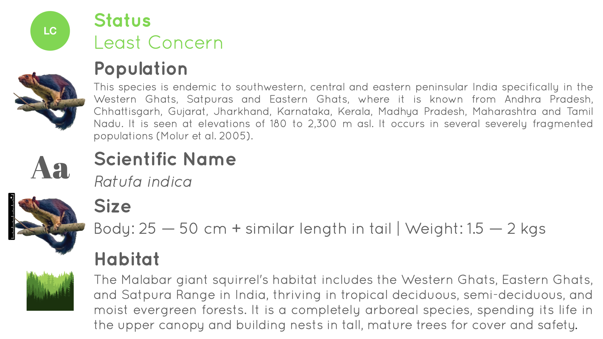 Giant Squirrels are members of the genus Ratufa. Like other members of the squirrel family, they also have the characteristic prominent incisors that aid them in feeding on large fruits and rough surfaces like barks. The members of this genus prefer forest areas with well-branched trees that they can use to build nests. While the Indian Giant Squirrel resides within evergreen and semi-evergreen forests, the Black Giant Squirrel prefers montane evergreen and dry deciduous forests, and the Grizzled Giant Squirrel resides in montane forests in riverine ecosystems. Among the three species, the Grizzled Giant Squirrel and Black Giant Squirrel are designated as Near Threatened on the IUCN Red List. Although the Indian Giant Squirrel is designated as Least Concern, its population too is fast decreasing. Due to their increased dependence on forest areas, the conversion of forest land for agriculture and developmental activities such as linear intrusion projects are significantly affecting populations across all three species. Habitat loss is also forcing the Grizzled Giant Squirrel to forage for food in farmlands, earning them the title of agricultural pests. They are killed by farmers to reduce crop damage, thus further reducing local populations.