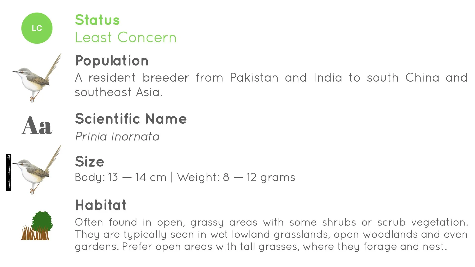 The Plain Prinia is not globally threatened (classified as Least Concern) and common in much of its extensive distribution area. One of the most widely distributed members of the genus and It is clear that the Plain Prinia has adapted well to living with humans, which will undoubtedly guarantee its survival in the foreseeable future.