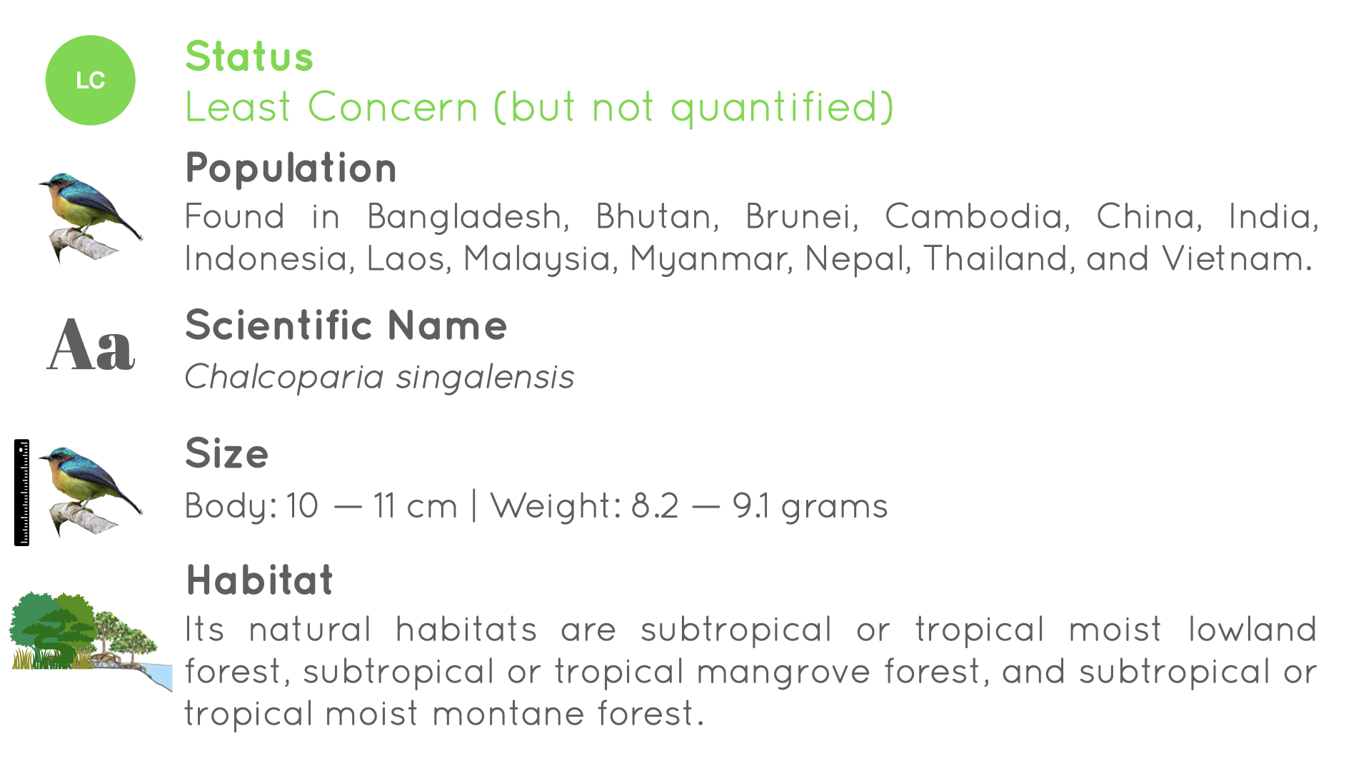 The Ruby-cheeked Sunbird is found in Bangladesh, Bhutan, Brunei, Cambodia, China, India, Indonesia, Laos, Malaysia, Myanmar, Nepal, Thailand, and Vietnam. Its natural habitats are subtropical or tropical moist lowland forest, subtropical or tropical mangrove forest, and subtropical or tropical moist montane forest.