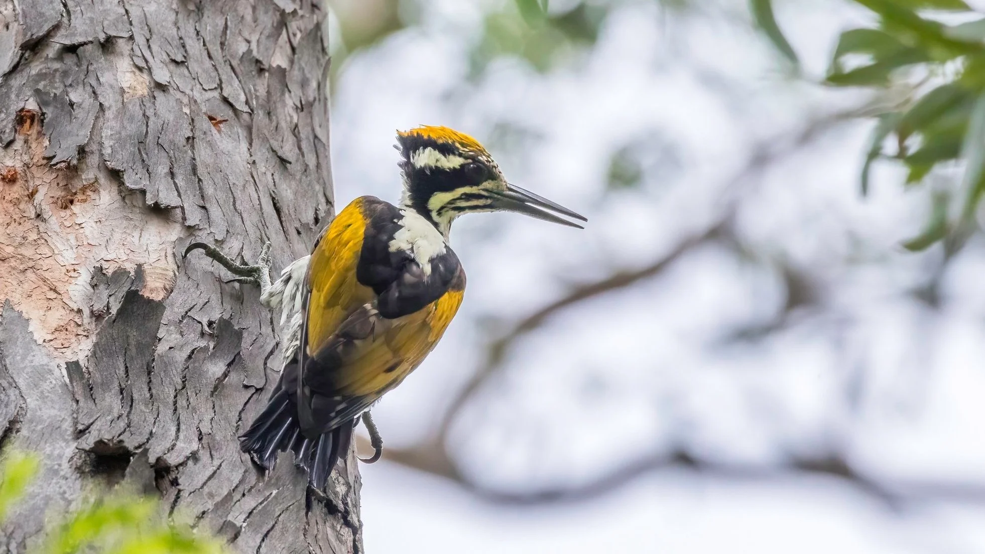 An uncommon, four-toed, large-billed, golden-backed woodpecker endemic to the Indian Subcontinent. It inhabits open wooded habitat all over its range, but is often difficult to find. Separated from the group of “small-billed” flamebacks by its much larger bill, a conspicuous white nape with a contrasting black border, and a divided black horizontal stripe below the cheek. Separated from the similarly large-billed Greater Flameback by its black rump, clean white nape, and preference for drier habitat.