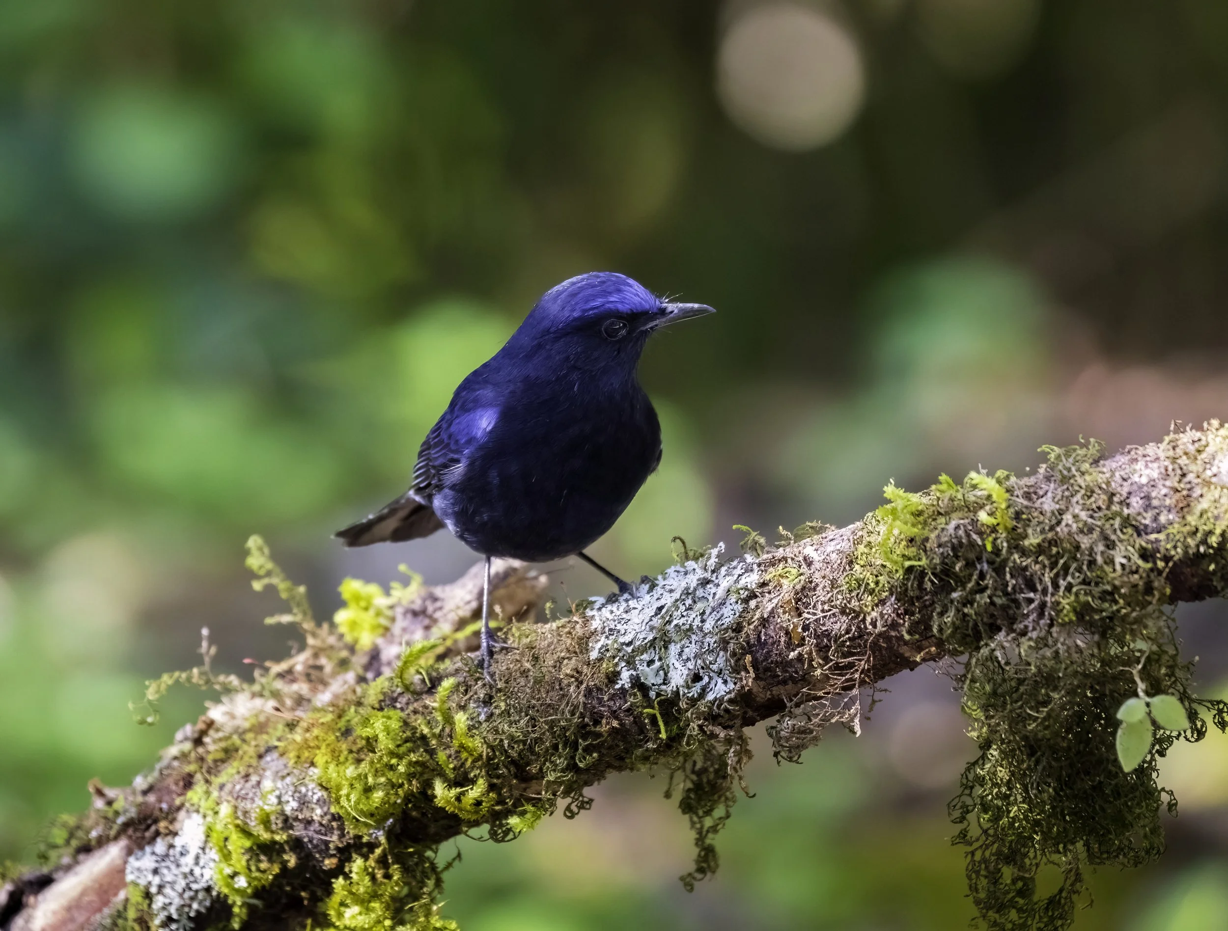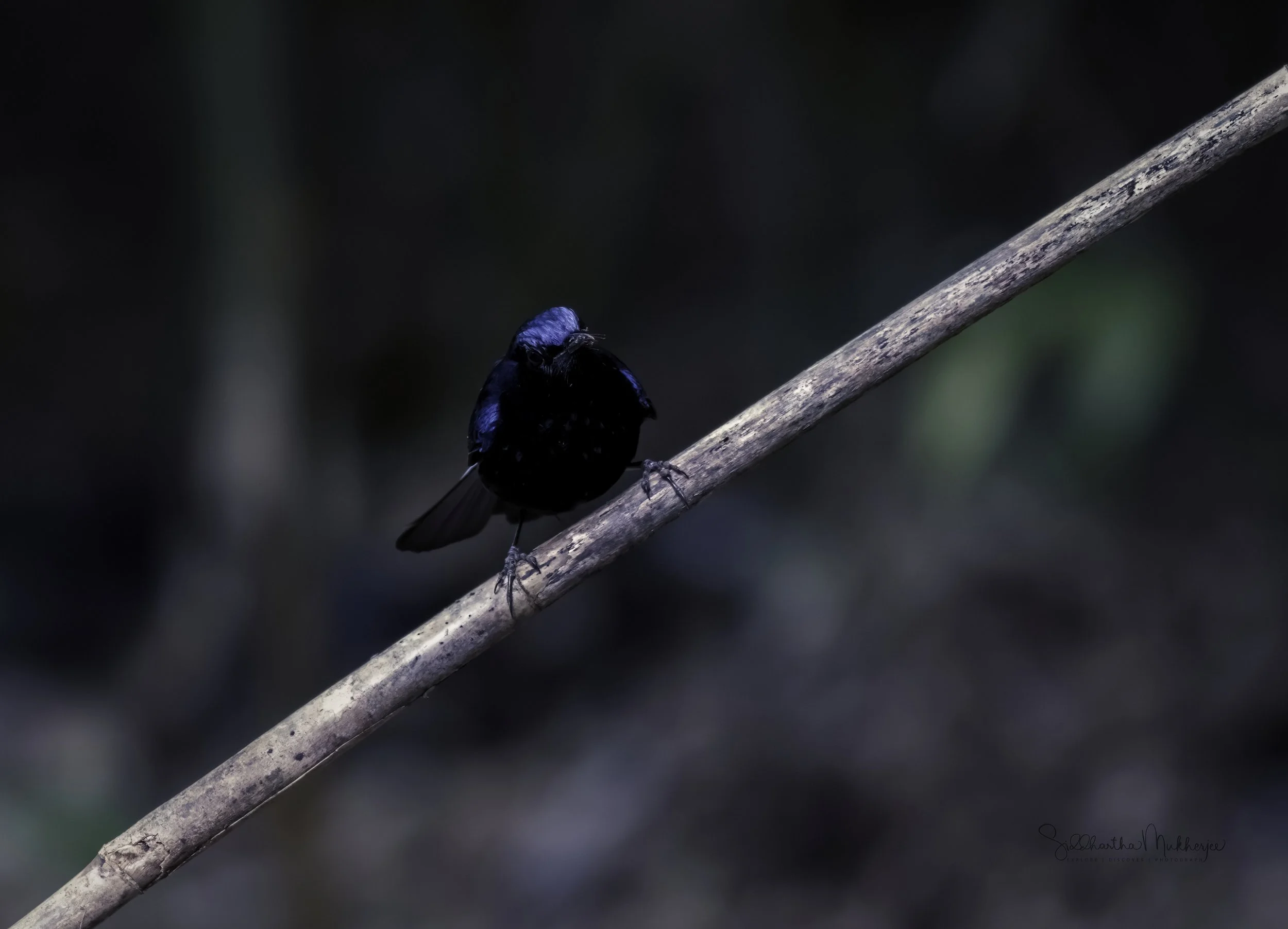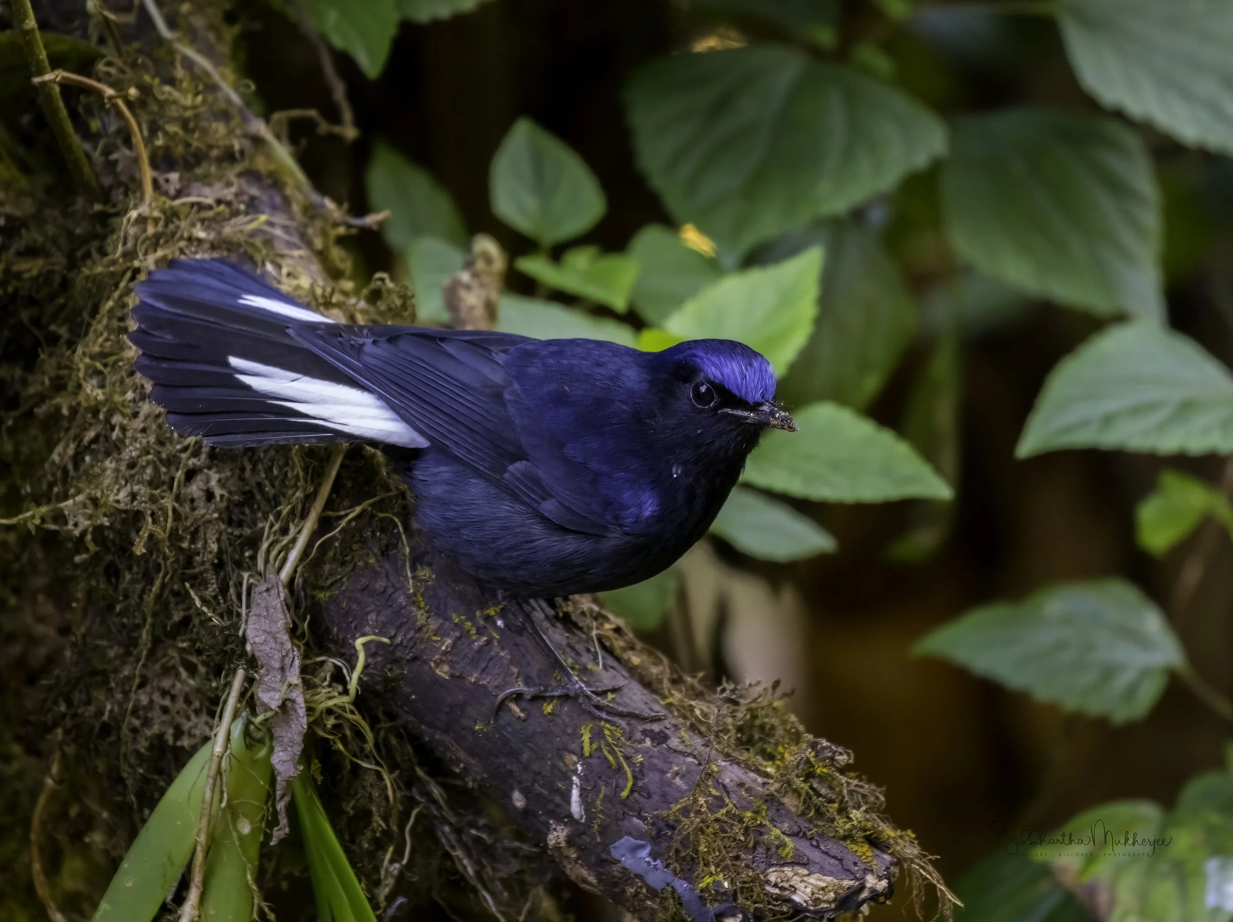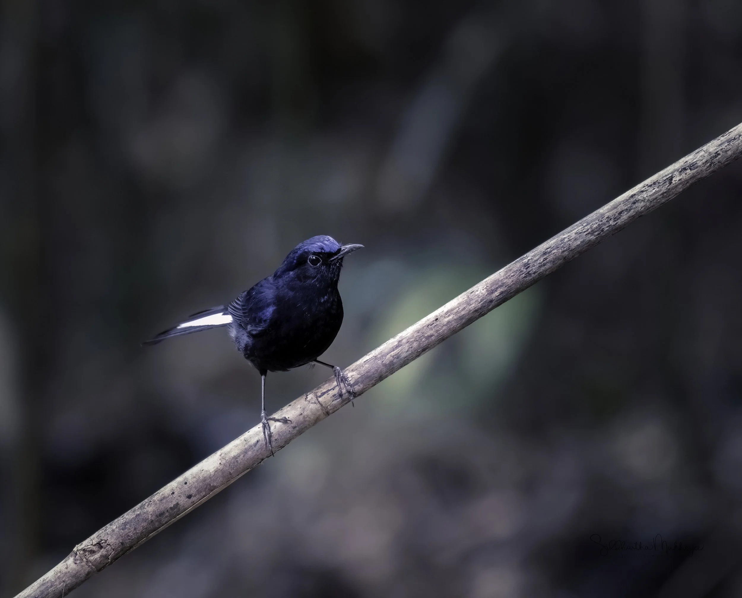 The White-tailed Robin (Myiomela leucura) is an Old World Flycatcher in the family Muscicapidae. It ranges across the northern regions of the Indian subcontinent and adjacent areas of Southeast Asia. It is found in Bangladesh, Bhutan, Cambodia, India, Laos, Malaysia, Myanmar, Nepal, Taiwan, Thailand & Vietnam. Its natural habitats are subtropical or tropical moist lowland forest and subtropical or tropical moist montane forest. It is a stately ground-dwelling songbird of dense mid- to upper-elevation broadleaf and mixed forests, particularly in areas with bamboo. The male is a striking rich blue with brighter patches on the crown and wings, while the female is brown overall with a white throat and belly. Both sexes have large white patches on sides of tail that flash brightly in the gloom of the forest when fanned - clearly visible in the first photo. When the white tail patch is not visible, its ground-dwelling habits and horizontal posture distinguish the male from the similar Large Niltava. The song is beautiful, a short series of ringing silvery whistles, usually rising. Most common call is a high thin “tzin.”