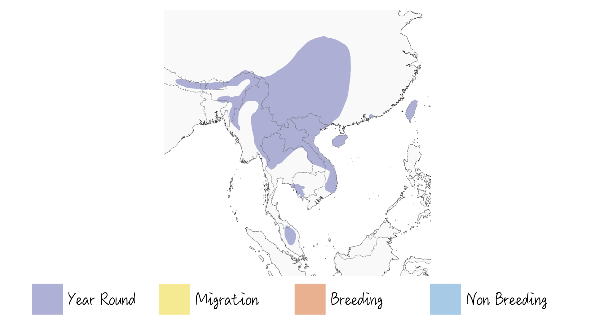 Myiomela leucura leucura: Distributed in Central and Eastern Himalayas from West Central Nepal to North East India (Arunachal Pradesh and South Assam hills) East to Central China (North to South East Gansu and South Shaanxi), South to Myanmar, North West and North Thailand, Laos, Vietnam, Peninsular Malaysia and Hainan.
