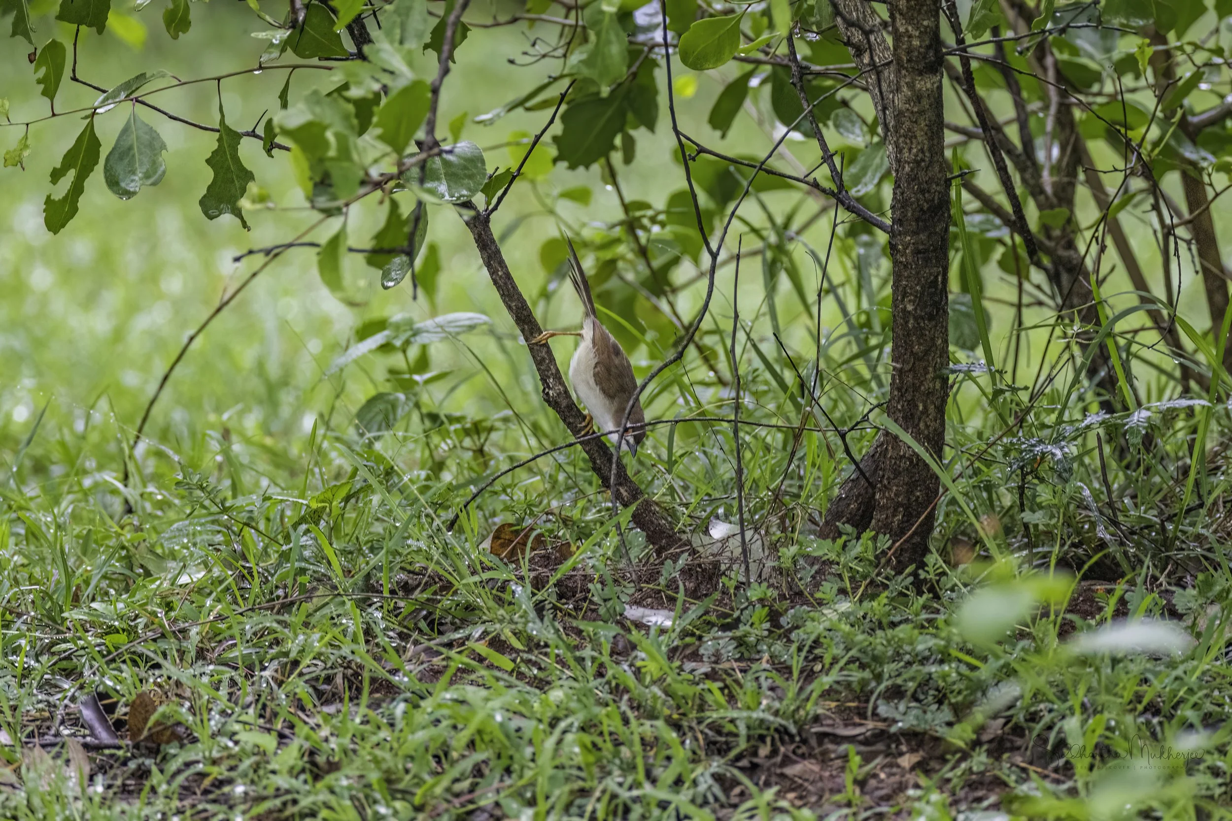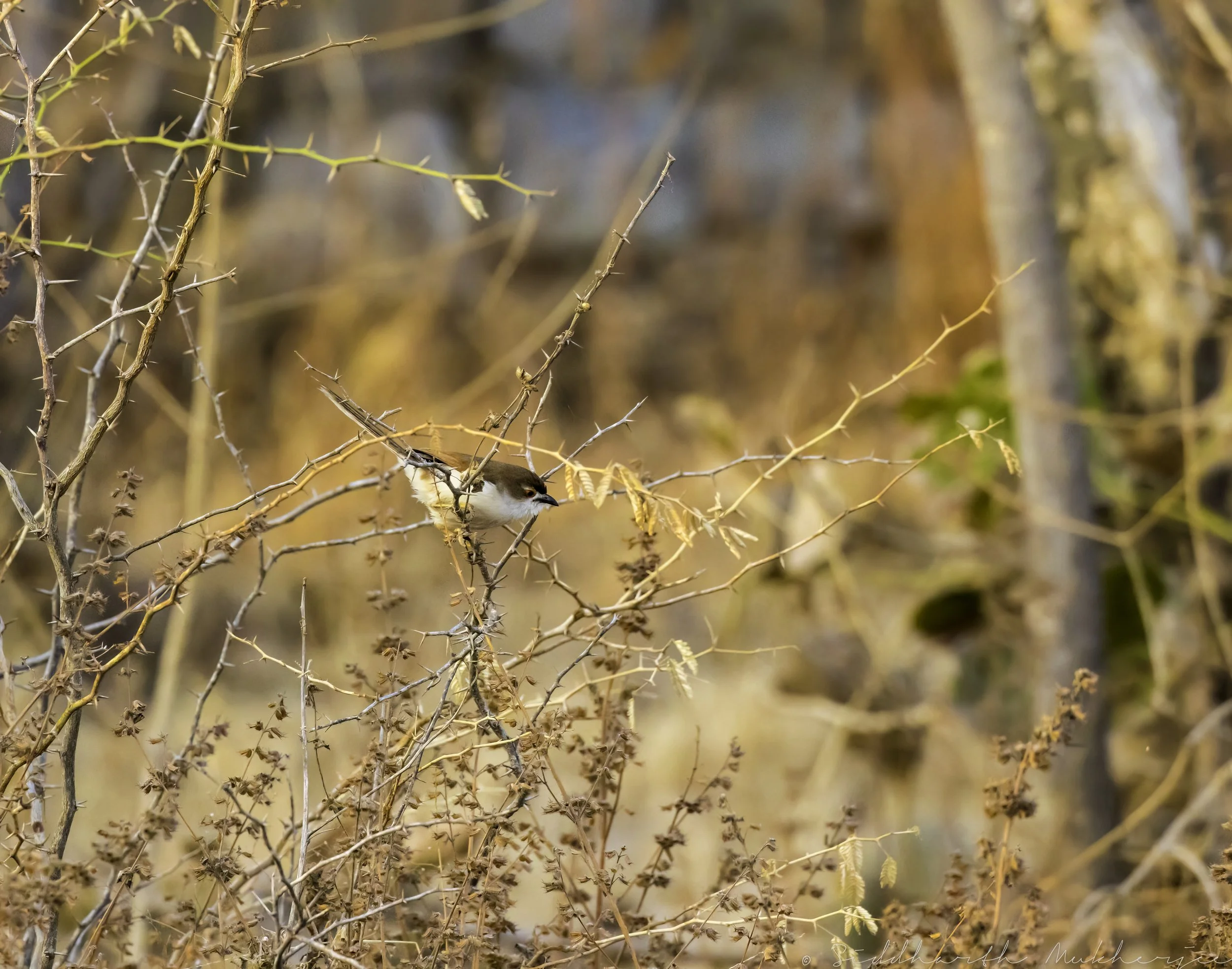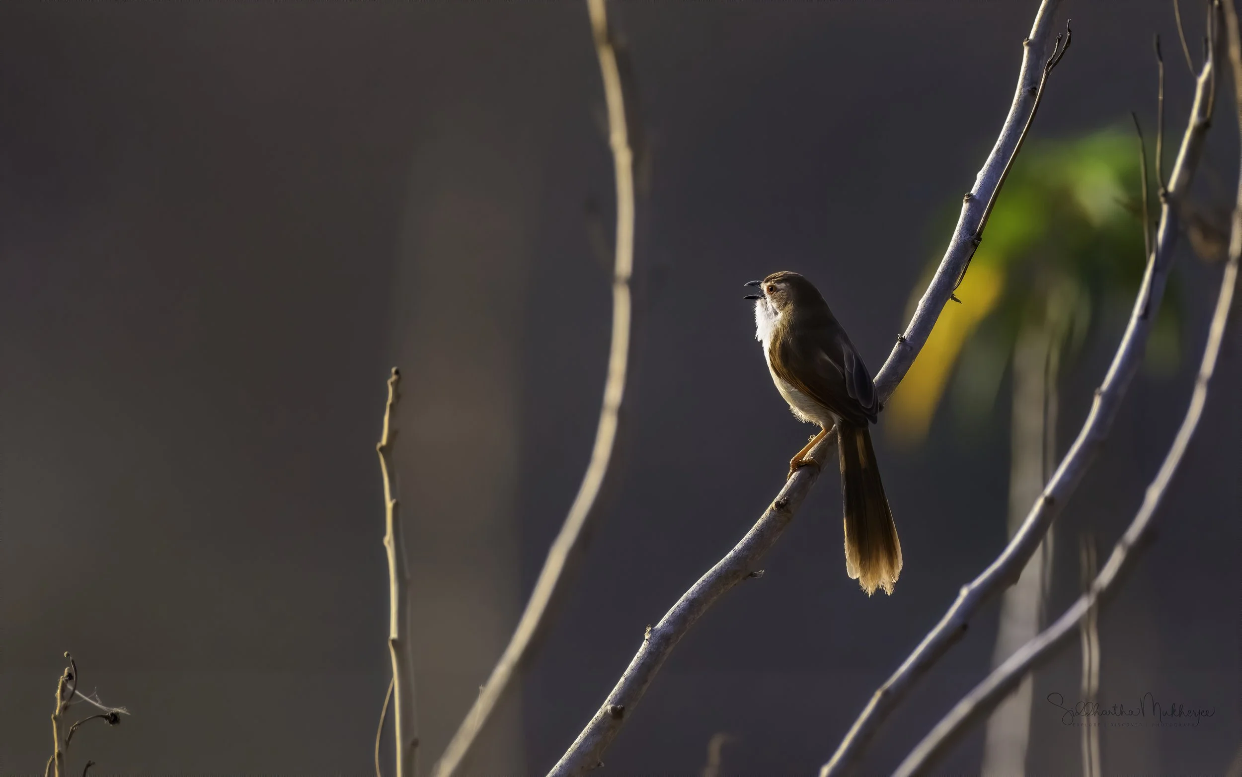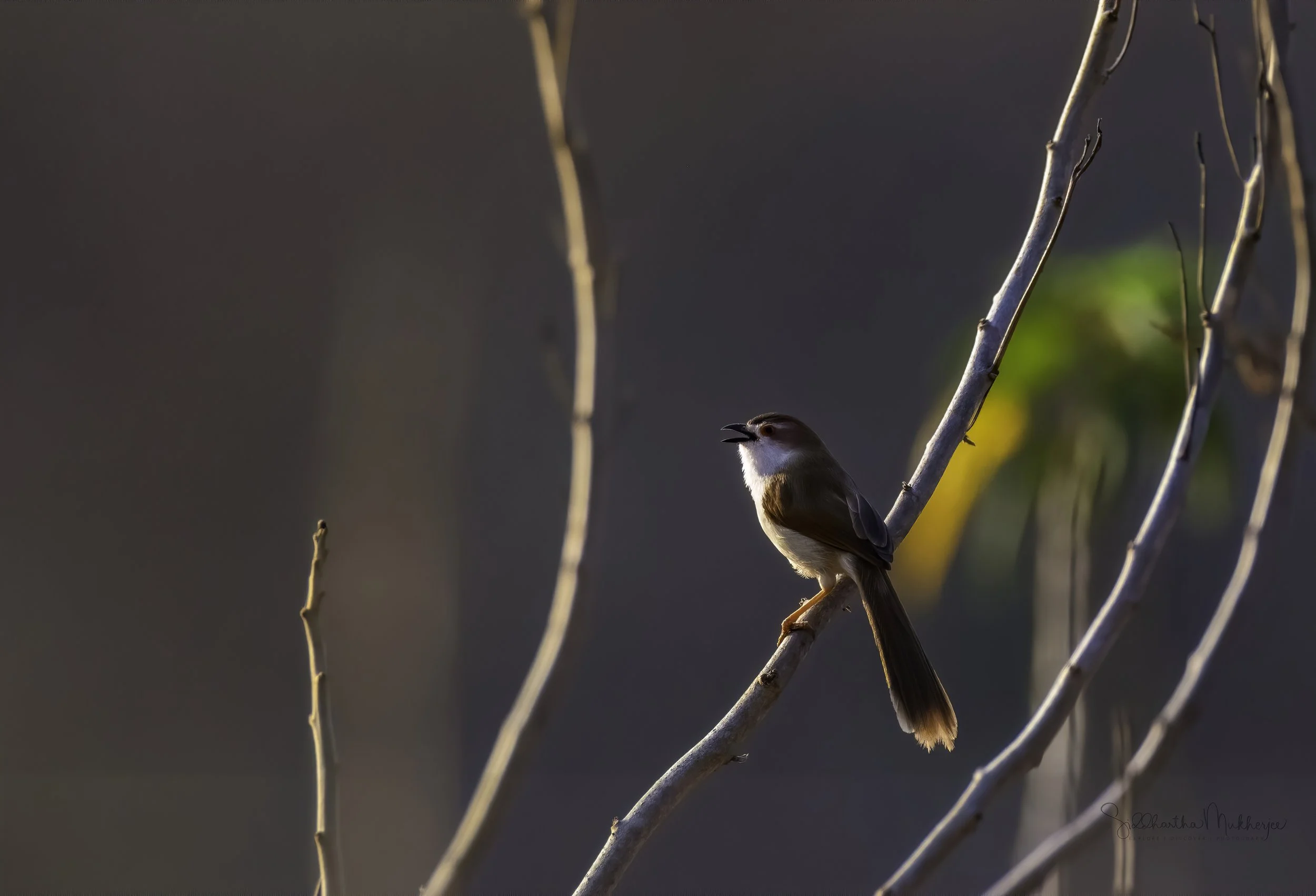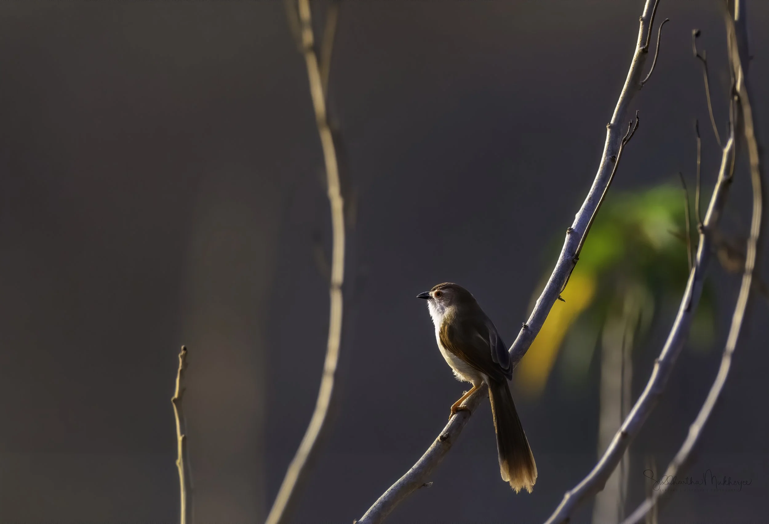 For this week, I am exploring deep within the Chincholi Wildlife Sanctuary, near Gottamgotta and the backwaters of the beautiful Chandrampally Dam. I found the Yellow-eyed Babbler perched in this gorgeous early morning light. The waters of the Chandrampally Dam had receded and were far in the distance making for a spectacular dark background against which the bird was beautifully sidelit. This is an odd-looking babbler which looks and behaves like a prinia on steroids. The Yellow-eyed Babbler is brown above and white below with rufous wingtips and a unique red eyering. It scrambles about in reedbeds, scrub, field edges, and grassy meadows in small flocks and pairs. It can be seen scaling stems like a parrotbill and hangs acrobatically like a tit or leaf warbler. Their strident, melodic song has a somewhat hoarse, nasal quality and their calls include repeated descending whistles, energetic chattering, and dry chittering..