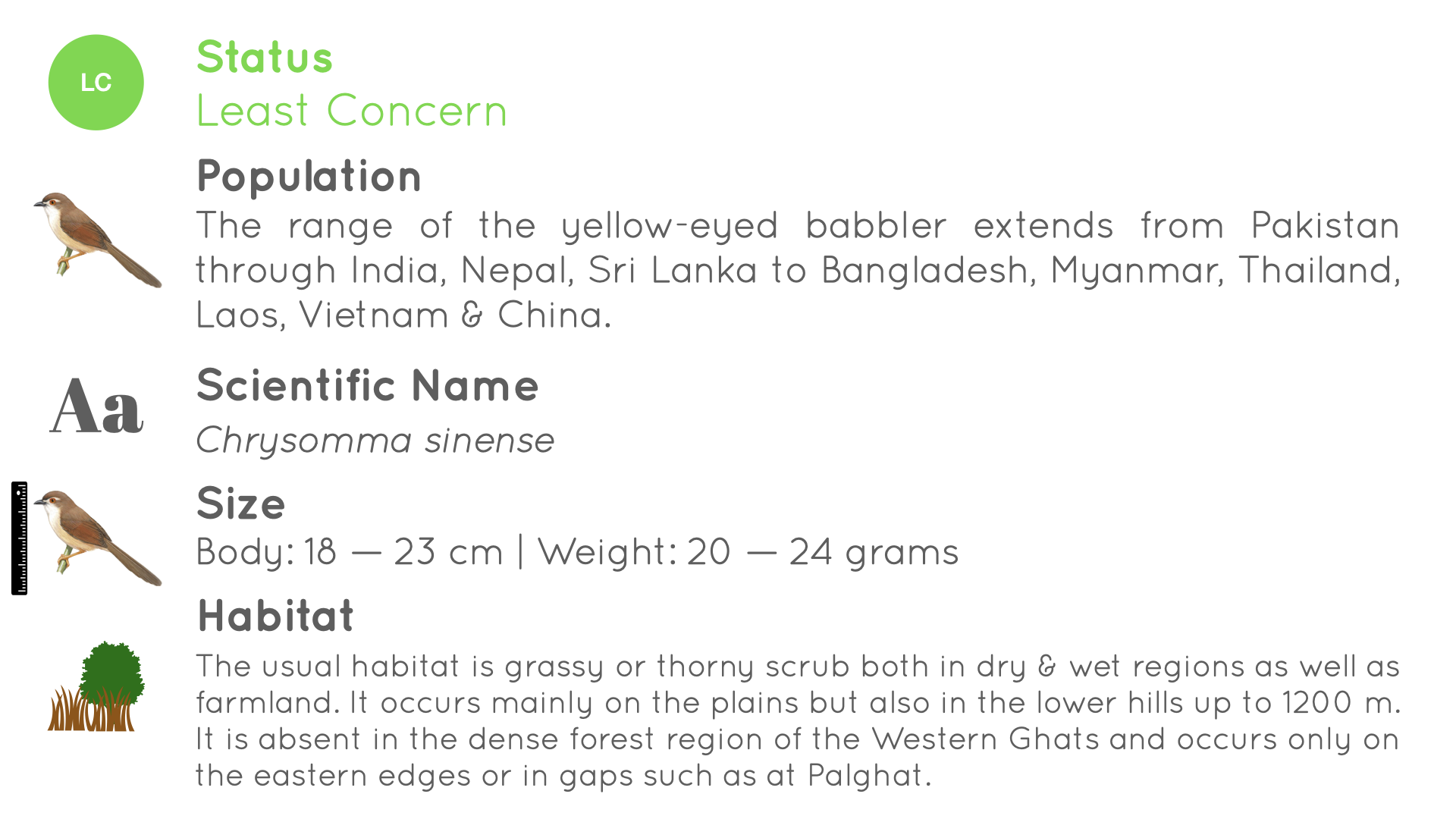 The Yellow-eyed Babbler is considered not globally threatened. It is uncommon and local in Pakistan and local to fairly common in Nepal, where it is present in the Royal Chitwan National Park. It is widespread and locally common in India, where common in Kalesar Wildlife Sanctuary (in Haryana), present (“seen quite regularly”) in Rajaji National Park and common in Dudhwa National Park (both Uttar Pradesh), occasional in the New Forest campus at Dehra Dun and fairly common in Dehra Dun valley, present in the Buxa Tiger Reserve (West Bengal), occasionally recorded in Kaziranga National Park (Assam), and present in Mudumalai National Park (Tamil Nadu). Widespread but local in Sri Lanka. Rare in the Sundarbans East Wildlife Sanctuary, in Bangladesh. It is locally common in China, where it has been recently recorded in Nonghua, Gulongshan and Diding Nature Reserves, in Guangxi; very common in Yunnan. Generally common in Southeast Asian range: seemingly localized in Indochina, where present in Pu Mat Nature Reserve and uncommon in Nam Bai Cat Tien National Park (Vietnam), and in Phou Dendin and Nakai-Nam Theun National Biodiversity Conservation Areas (Laos); widespread and common in Thailand, although only locally common in Khao Yai National Park.