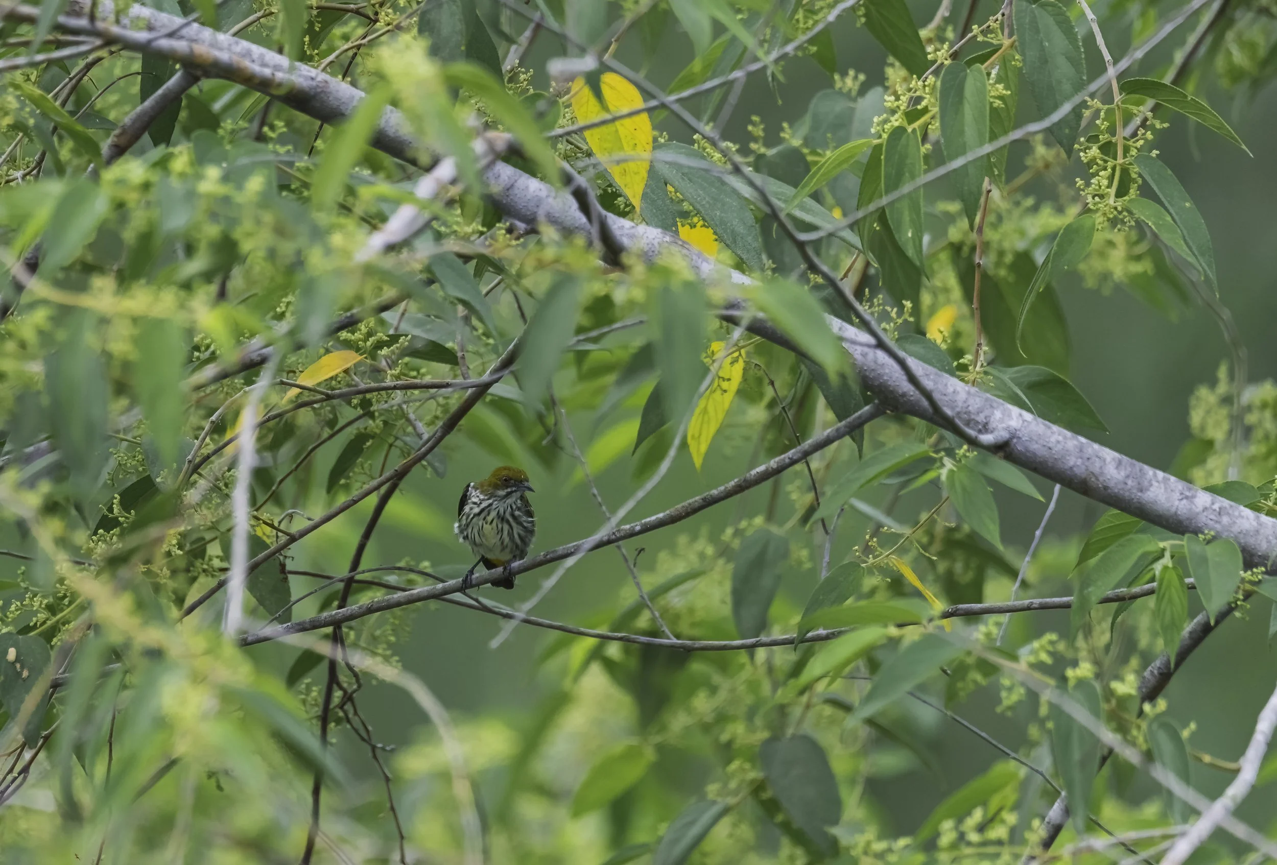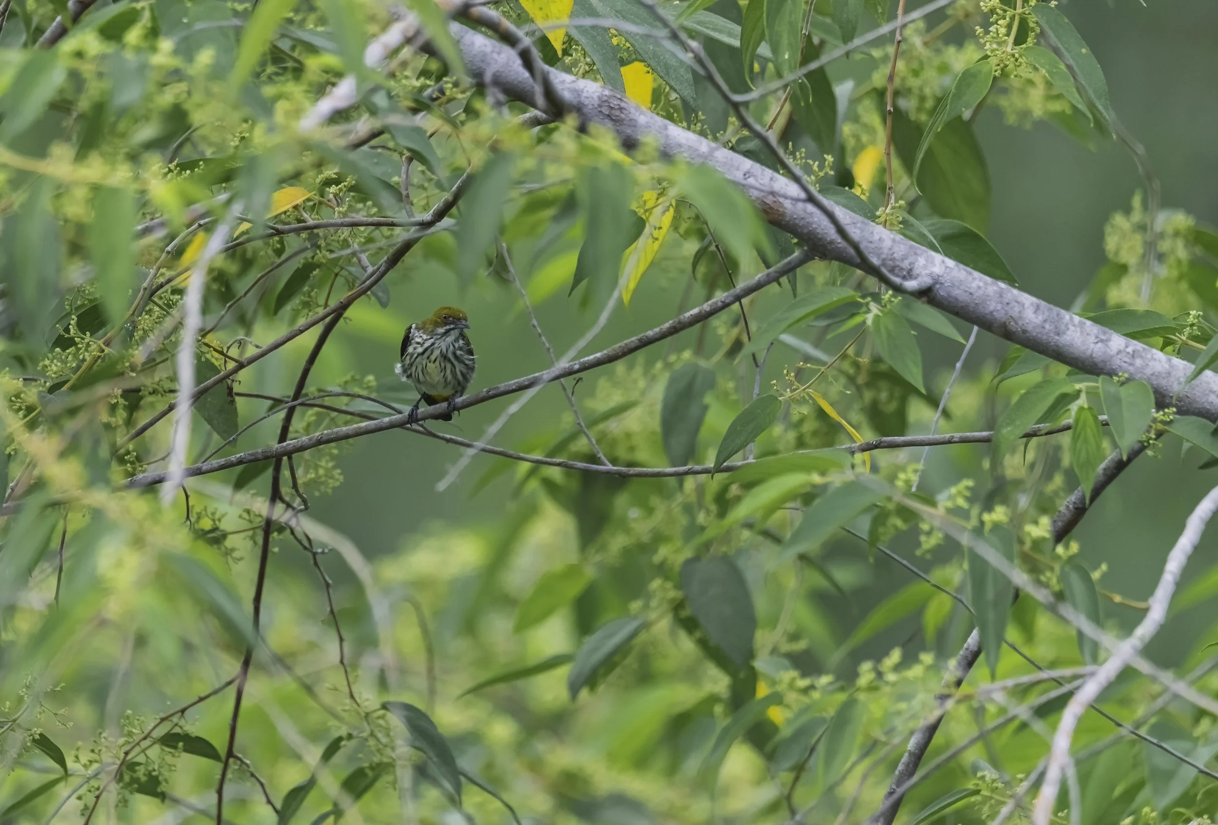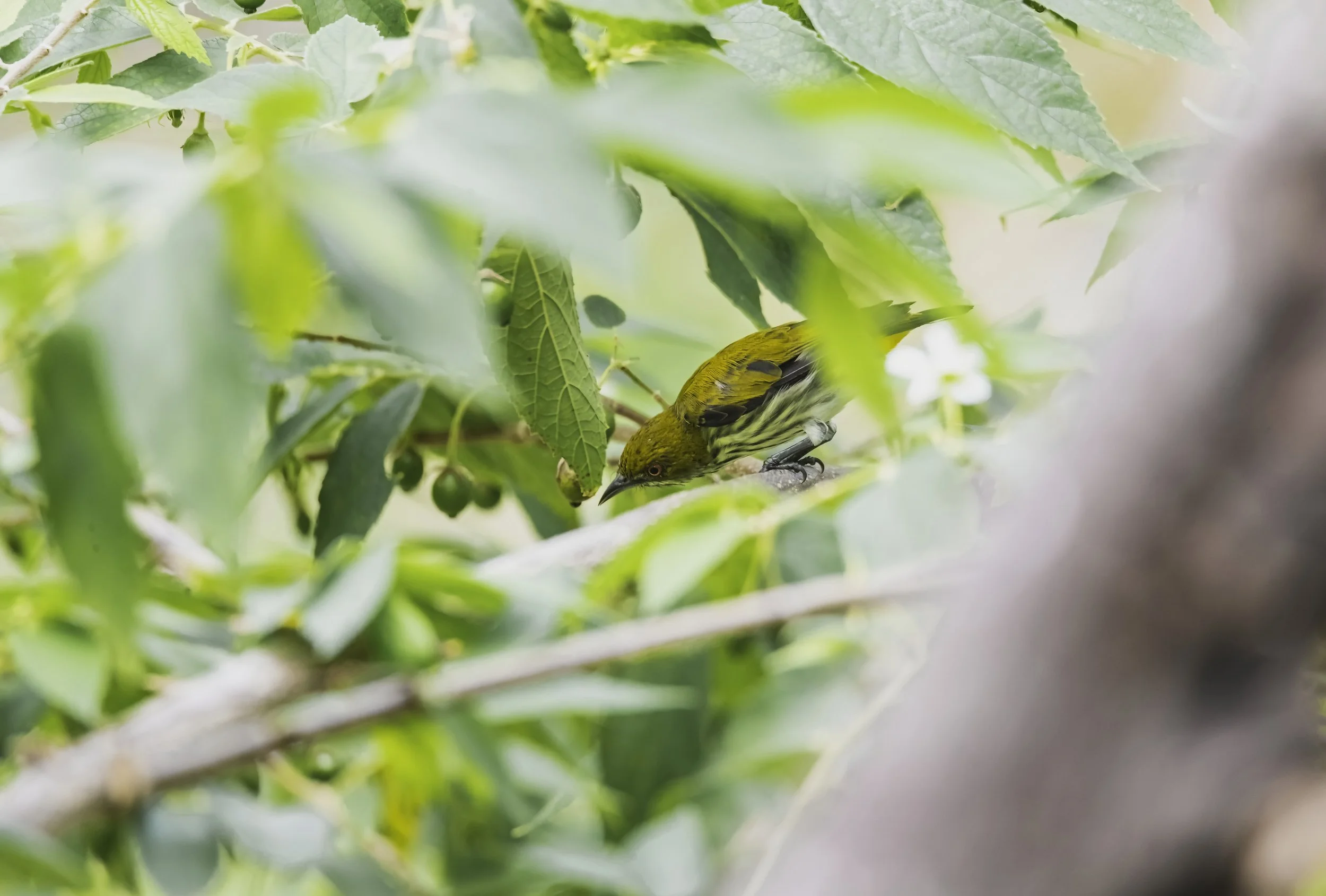 Look for a tiny bird with bright olive-green upperparts and bold black streaks on a creamy white breast. The namesake yellow or orange undertail-coverts(vent) and its "demonic" red eyes are diagnostic. It is often seen hanging from branches to forage or making quick, "snipping" calls that sound like scissors (tsit-tsit). Use the early morning light at the garden's edge before the bird retreats into the denser forest canopy as temperatures rise.