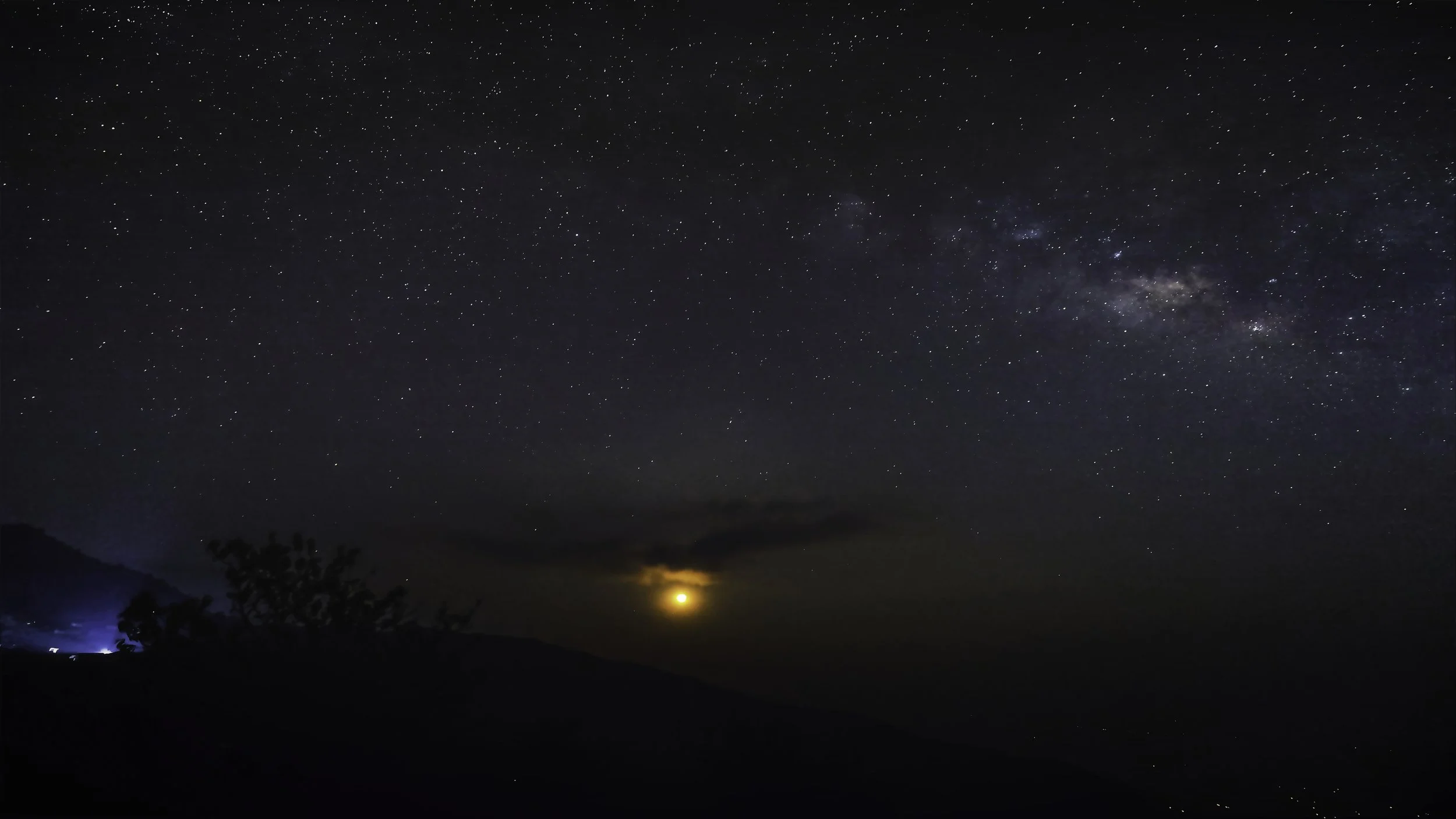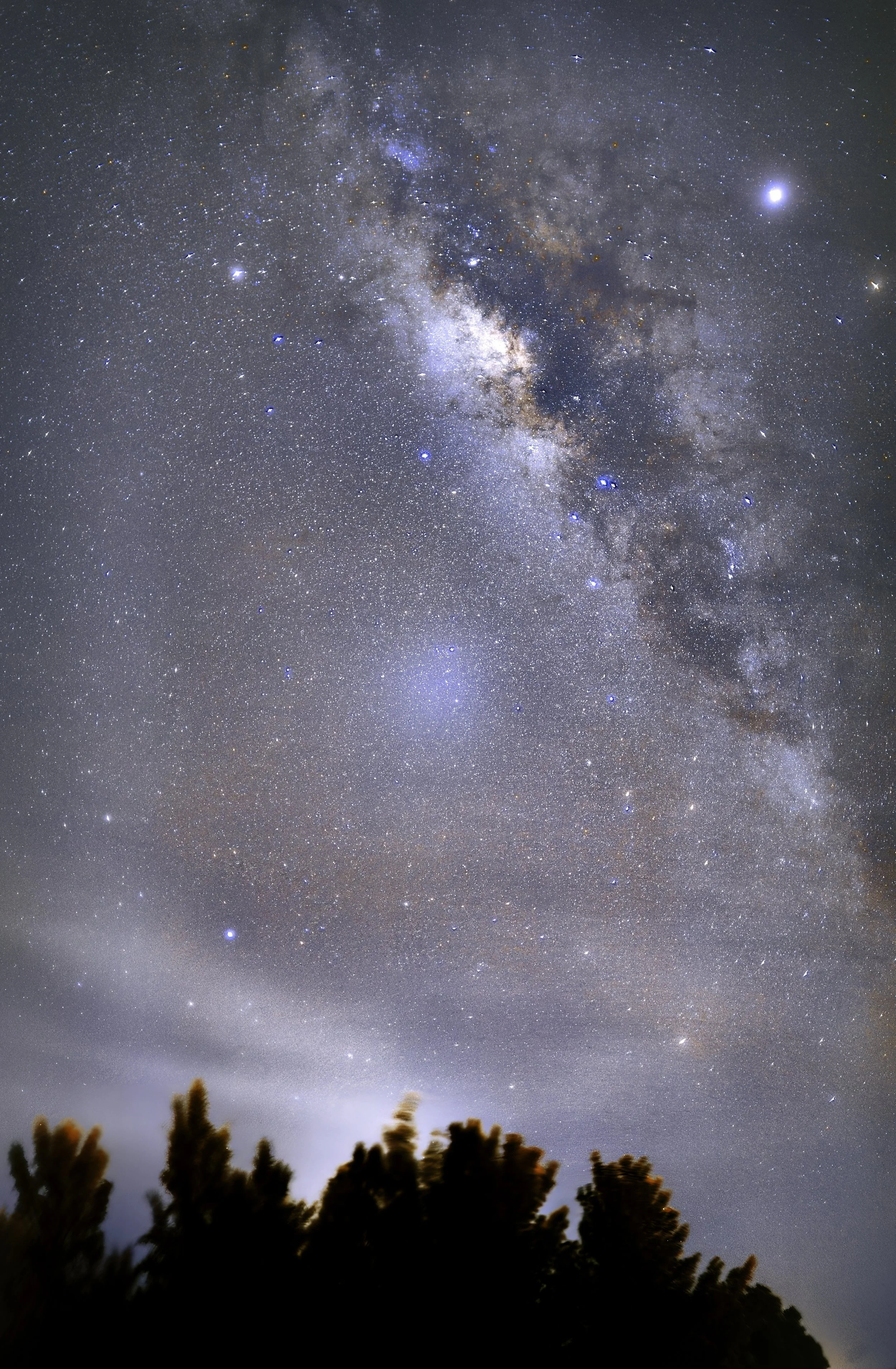 The following Milky Way composite is a stack of 23 photos to eliminate noise taken while waiting for the Perseids near my home city of Hyderabad. Pointing south as the core was setting, this sequence of photos is from the Canon 1Dx Mark ii wearing the Samyang (Rokinon) 14mm f/2.8 IF ED UMC at f2.8, ISO 2500 and exposed for 19 seconds at an altitude of 2,037.73 ft above MSL. The sky here is a Bortle 4 which is basically a brighter rural ambience. Under these skies the zodiacal light is still visible, but does not extend halfway to the zenith at dusk or dawn and there are light pollution domes visible in several directions as you can see here. The clouds are illuminated in the directions of the light sources, dark overhead and surroundings are clearly visible, even at a distance. The Milky Way well above the horizon is still impressive, but lacks detail. The portion of the Milky Way seen here is the section containing the zodiac constellations of Sagittarius and Scorpius observed just above the tree.