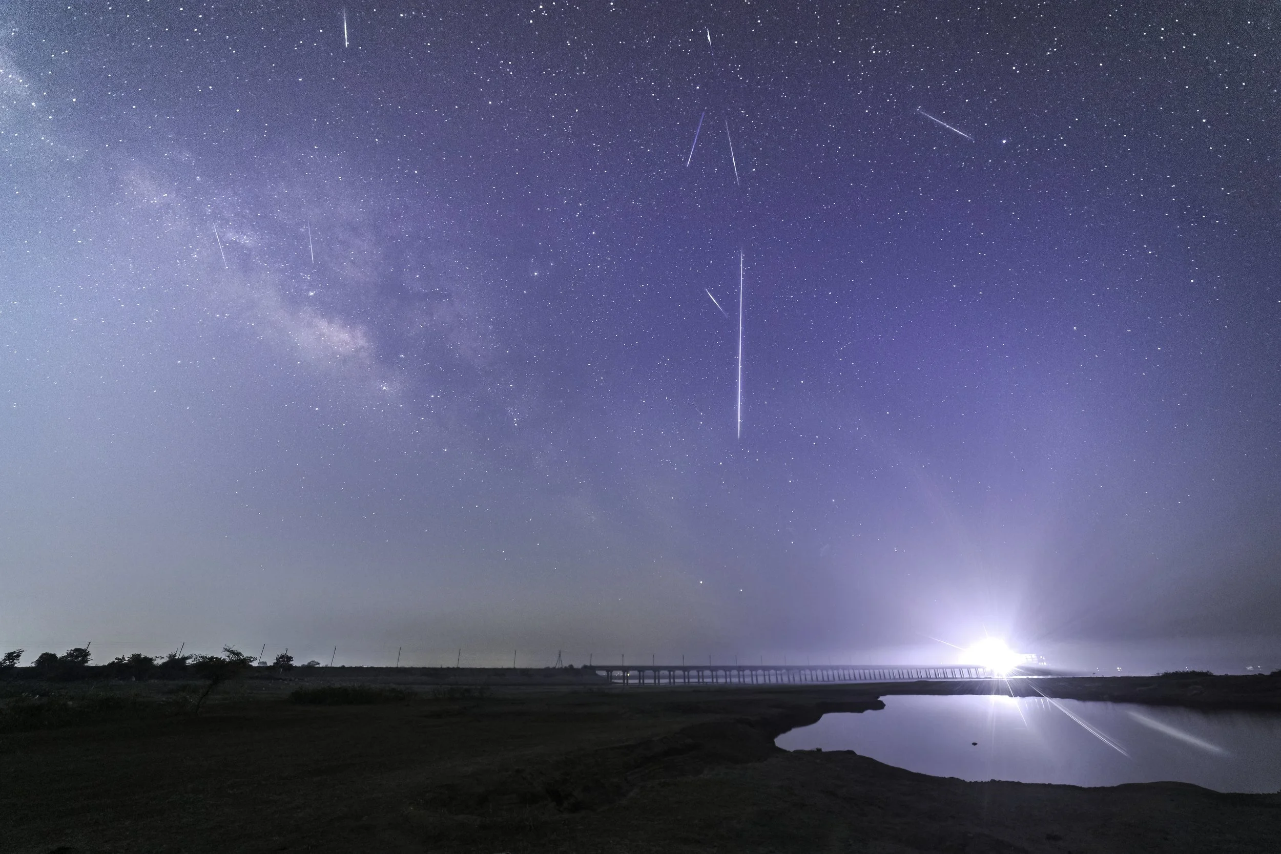 9 separate meteors captured throughout the night composited into a single image with the Milky Way.