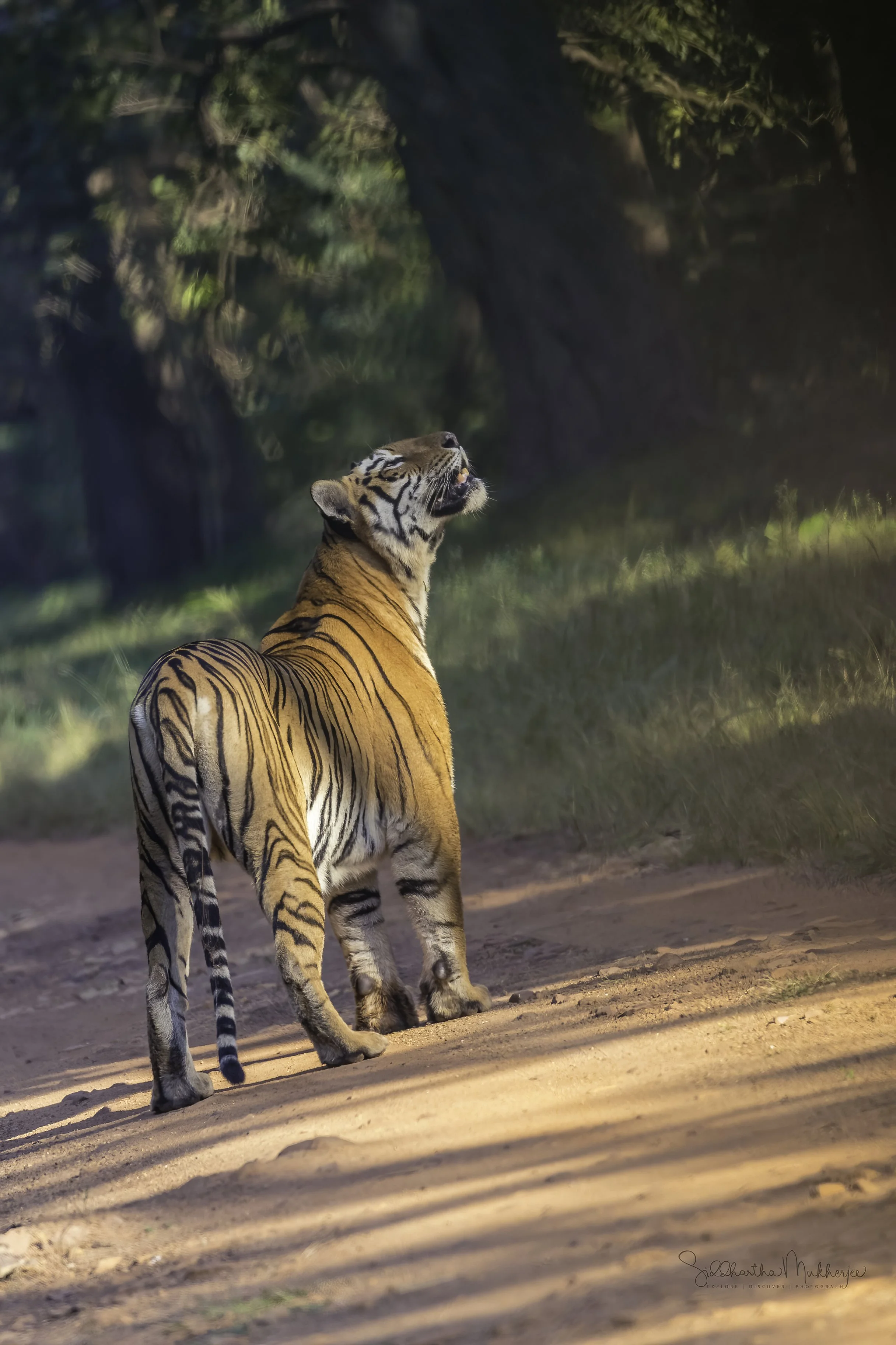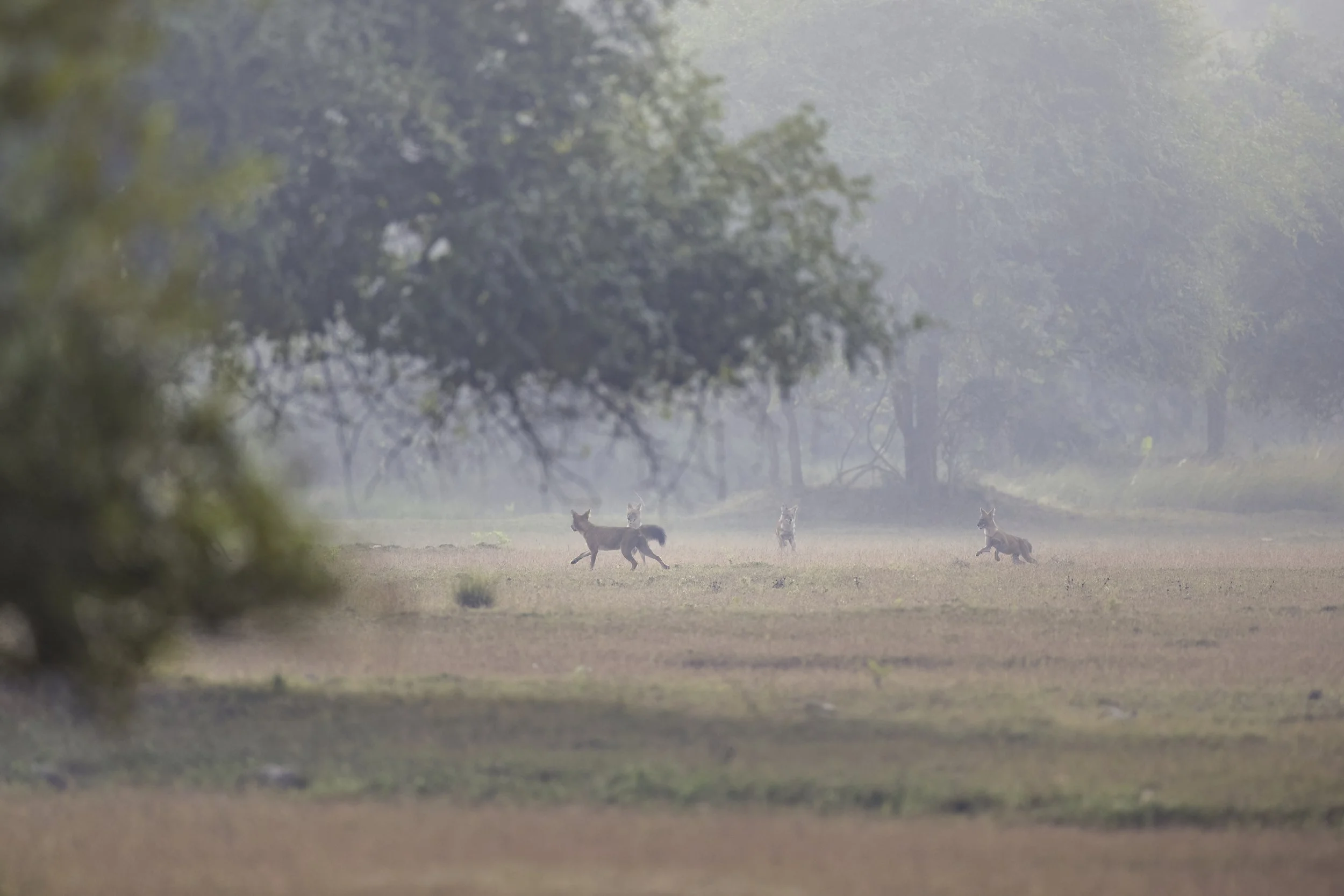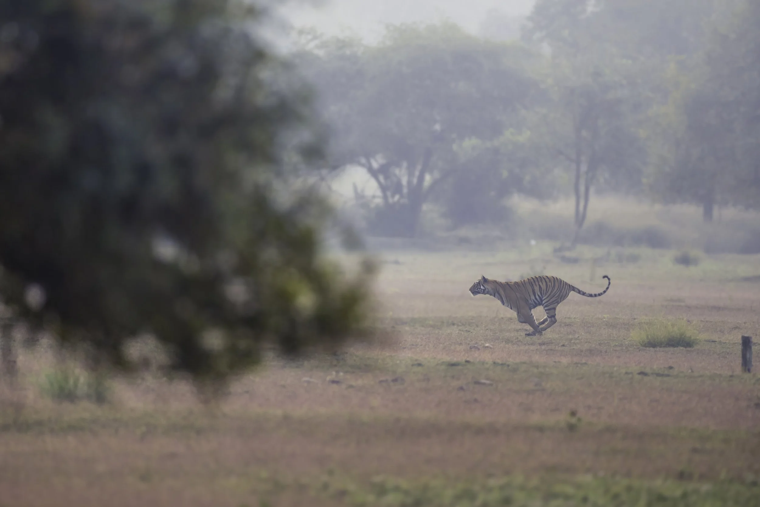 On a cold November '23 morning we headed out towards the Tadoba Lake deep in the core and came across the pug marks of a tigress headed towards the Jamunbodi Waterhole. We quickly made our way to the waterhole and spotted a pack of dhole resting. Neelkanth Maghre, our tracker and guide, said there might possibly be a kill. To our right were some Sambhar who were clearly agitated and constantly gave their distinctive alarm calls. We waited with bated breath as the sambhar took off running from the right to the left. And following closely on their heels was Bijli, running full tilt, after them. This was taken as she sped across the meadow before disappearing behind the trees. The resting dhole pack also was hot on her heels and made for an amazing experience.