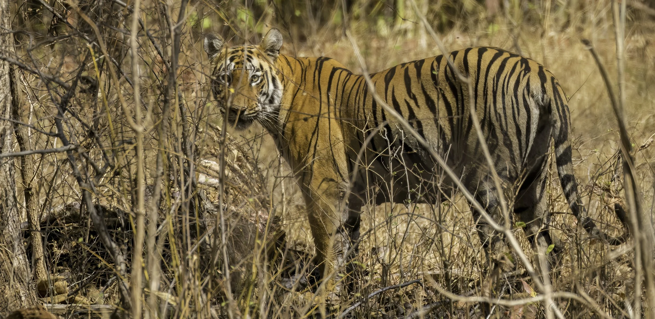 Undoubtedly as big as his father, the huge and bold Veer is now the undisputed king of Tipeshwar. In 2021, hunting new territory, Veer disappeared from Tipeshwar, leaving his trail across many ranges. He was captured on a camera trap in the Darwha Forest Range - a division of the East Yavatmal Forest Division - in August 2021. It was expected that he would further make his way towards the Dnyanganga Sanctuary near Buldhana but he returned to Tipeshwar in 2023. The forests of Tipeshwar were, at the time, dominated by the mighty Zanjeer and the Paunar male. Veer, through his sheer cunning and prowess eventually overcame all challenges and is now the undisputed king of the entire region.